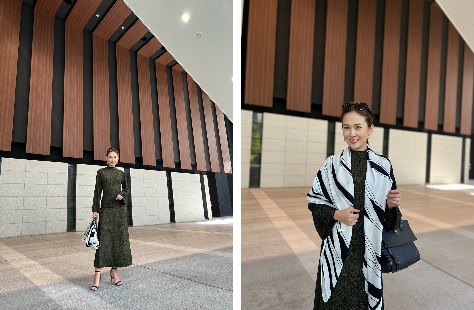 “上品なメタリックの糸で編まれたニットとスカートのセットアップ。着るだけで華やかで、落ち感のある生地が身体をほっそり見せてくれます。スカートは長めの丈で穿きたかったので、あえてサイズを上げて腰で穿いています。” By Maico さん/ @maico0327