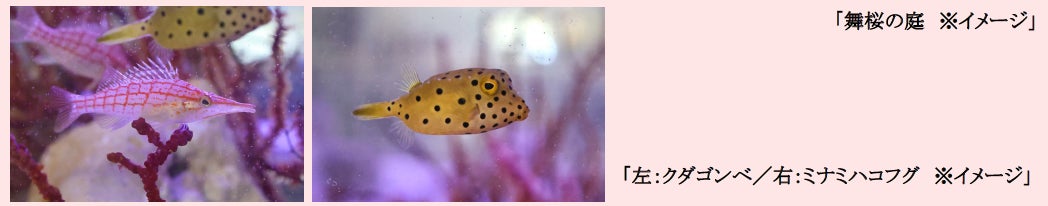 を出す「メジロダコ」。5分咲きはピンクとイエローが入り混じる華やかな色彩を持ち、存在感のある「マダラハナダイ」、花びらのような淡いカラーと群れる習性が“桜吹雪”を連想させる「ハナビラクマノミ」など、“桜の開花”になぞらえて魚たちの習性や魅力をお伝えします。