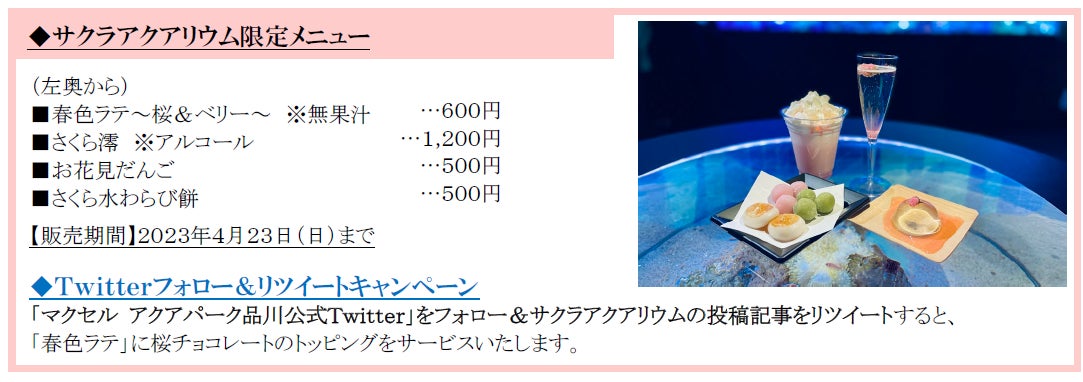 | 【期間】3月4日(土)~4月23日(日) 【内容】「品川プリンスホテル」でのご宿泊+水族館入場券+コーラルカフェバーのワンドリンク(さ くらスカッシュ) 【料金】メインタワー ツインルーム(1室2名さまご利用時)1名さま:13,695円より ◆同プランの詳細、ご予約は下記URLよりご確認いただけます。 https://www.princehotels.co.jp/shinagawa/plan/sakura2023/aqua/ |