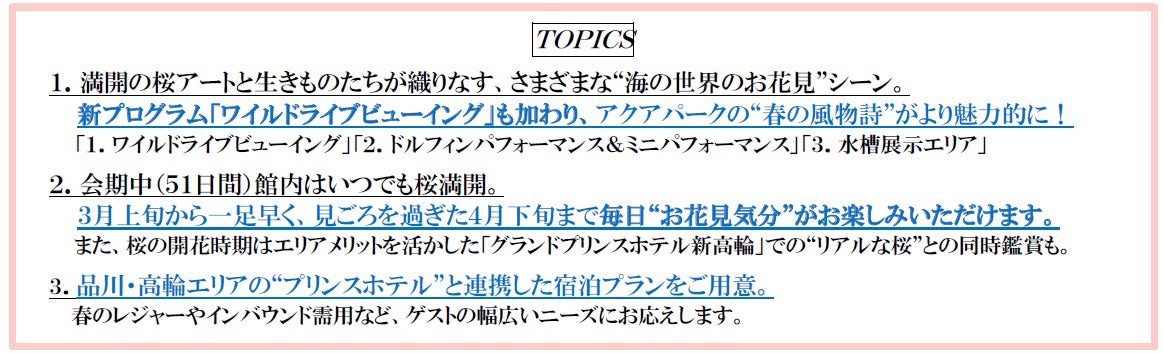 例年、桜を楽しむための多彩な“お花見スタイル”が登場する中、当館は【生きもの×デジタルテクノロジー】という施設特長を活かし、日本が誇る春の情景と海の世界が織りなすオリジナリティあふれる空間・コンテンツで非日常のひとときをお届けします。さらに、会期中(51日間)館内はいつでも桜満開。3月上旬から“一足早いお花見気分”に浸れ、開花時期には高輪エリアに咲く“リアルな桜”との同時鑑賞が可能、見ごろを過ぎた4月下旬までお花見がお楽しみいただけます。また、屋内型のハードは天候や気温、花粉などの影響を受けることなく常時快適にお過ごしいただけ、『品川プリンスホテル』内に位置する水族館として、品川・高輪エリアのプリンスホテルとの宿泊プランもご用意しました。