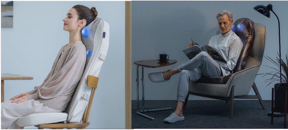 【3Dマッサージシートプレミアム2】は、持ち運びできるサイズと重量で、ご自宅の椅子やソファに設置するだけで使用できるスマートなシートタイプのマッサージャーです。ヘッド部分は3段階の角度調節が可能となり、身長差を問わず使う人の首肩に合わせてフィットしたマッサージが体感できるようになっています。