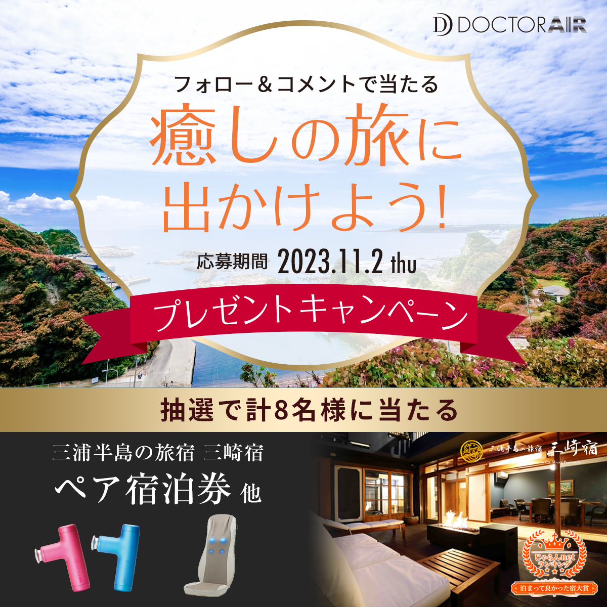 一年の疲れを癒やす三浦半島への旅や、ご自宅でのリフレッシュタイムに活用できるドクターエア製品があたるキャンペーンにぜひご参加ください!