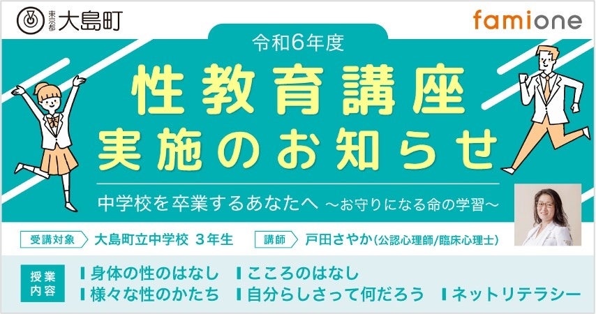 「子どもを願うすべての人によりそい 幸せな人生を歩める社会をつくる」をビジョンに掲げ、法人の従業員向け福利厚生や自治体の住民向け支援を行うヘルスケアサポートサービス「ファミワン」 https://famione.com/benefit/ などを展開する株式会社ファミワン(本社:東京都渋谷区、代表取締役:石川勇介)は、東京都大島町(町長:坂上長一、以下大島町)からの委託を受け、大島町内にある、大島町立第一中学校及び大島町立第二中学校の3年生を対象に、2025年1月27日(月)、 2月10日(月)に性教育講座「中学校を卒業するあなたへ〜お守りになる命の学習〜」を開催いたしました。