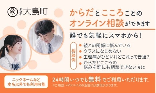 からだやこころについて、匿名で24時間いつでも無料でオンライン相談することができ、利用方法を記したカードを大島町内の中学生に向けて配布いたしました。
