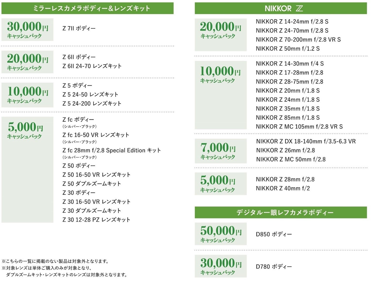 内容:キャンペーン期間中に対象製品を購入し、ニコンイメージング会員の登録並びに製品登録※1の上、所定の応募用紙に必要書類を揃えて応募された方全員にキャッシュバック※2いたします。