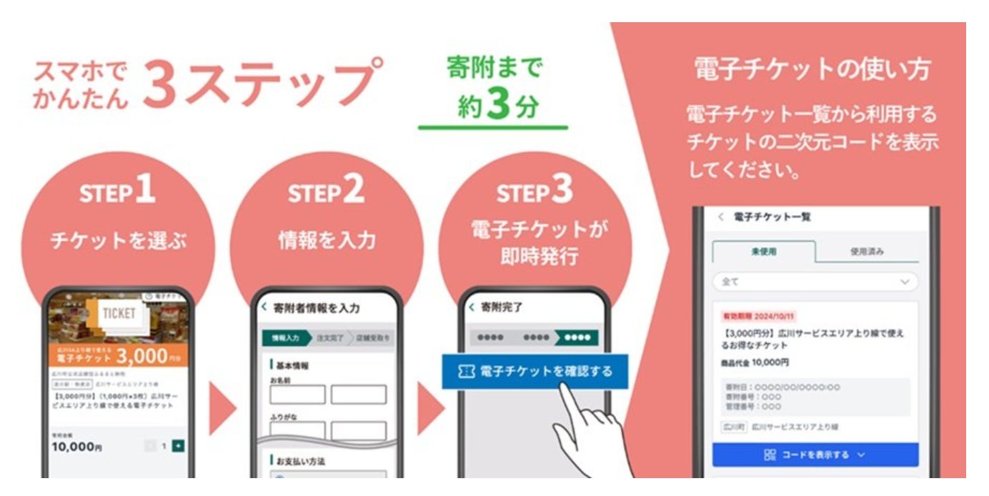 電子チケットは、広川SA(上り線)のショッピングコーナーでご利用でき、広川町のいちごやお茶等の地場産品と、明太子やもつ鍋等の福岡県共通返礼品にご利用いただけます。