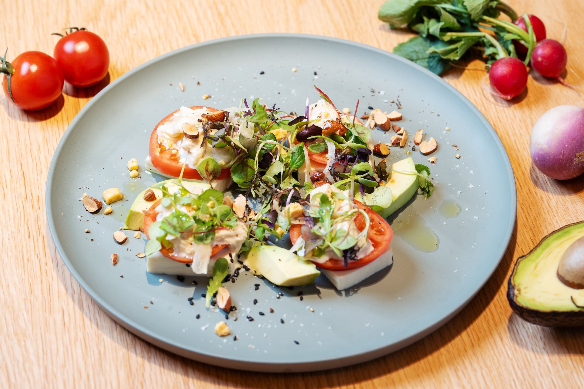⾖腐は塩で⽔分を抜きフレッシュチーズ⾵仕⽴てにし、九州産の美味しいトマトと濃厚でコクのある⿅児島県産の湯葉を合わせました。