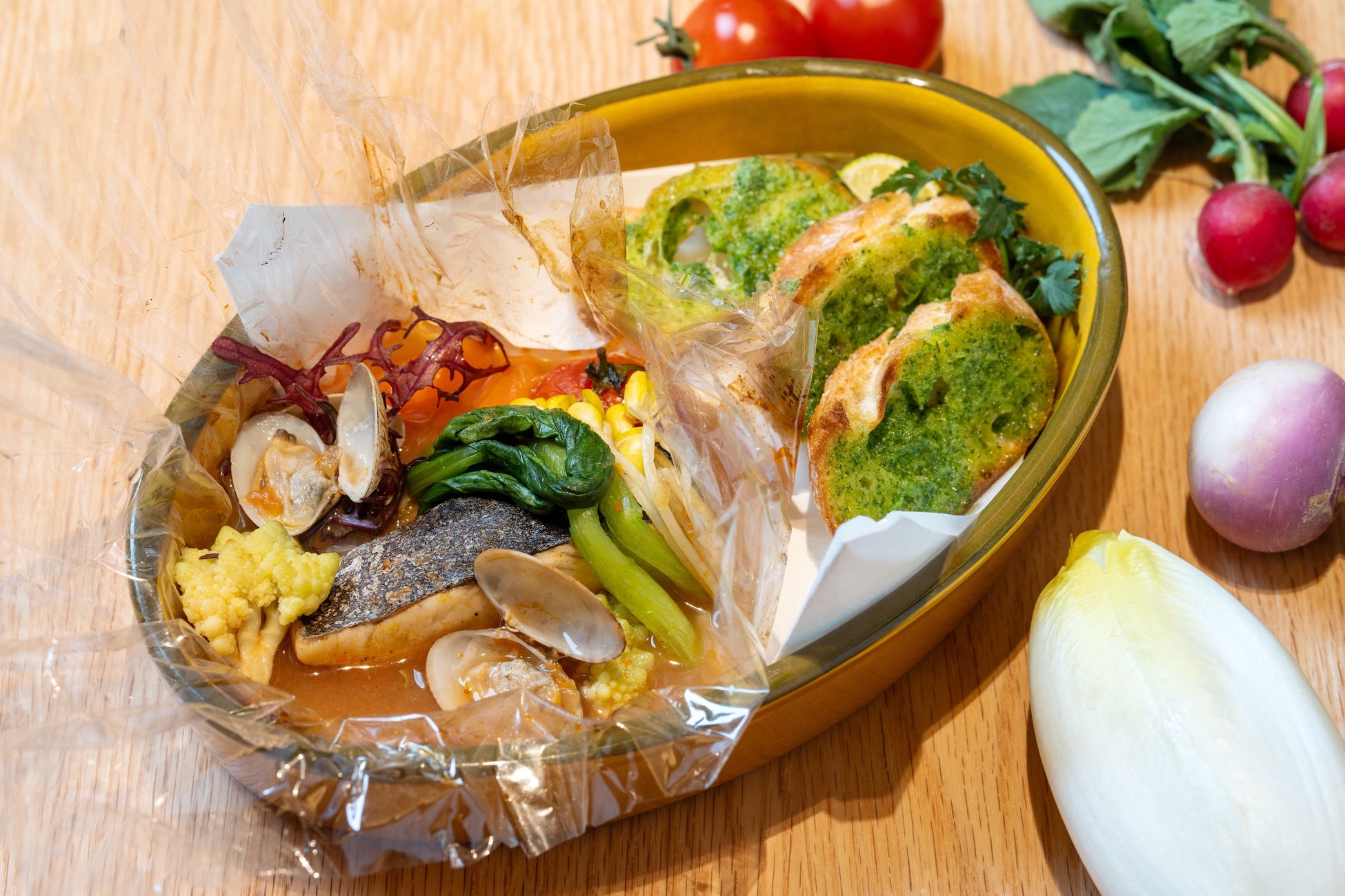 ⽞海産の鰆とあさり、旬の野菜に鰆の出汁を加え、それを特殊な透明のフィルムで包み込み、蒸し焼きにしました。⿂介のうまみと野菜の⽢みが溶けこんだスープに、添えてあるパンを浸してお召し上がりください。また、蒸し上がった熱々のフィルムを開けた瞬間に漂うハーブの⾹りもお楽しみ頂ければと思います。
