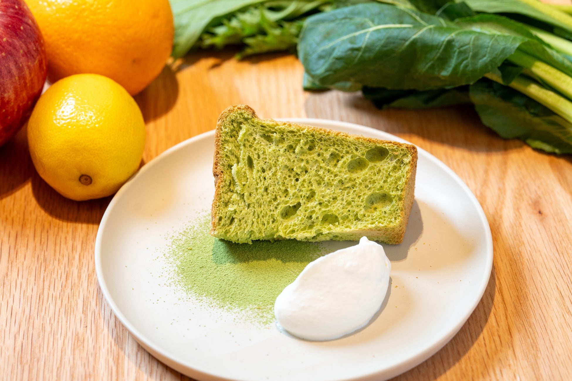 福岡県産のほうれん草で作るシフォンケーキは、メレンゲをたっぷり含ませふわふわに仕上げました。