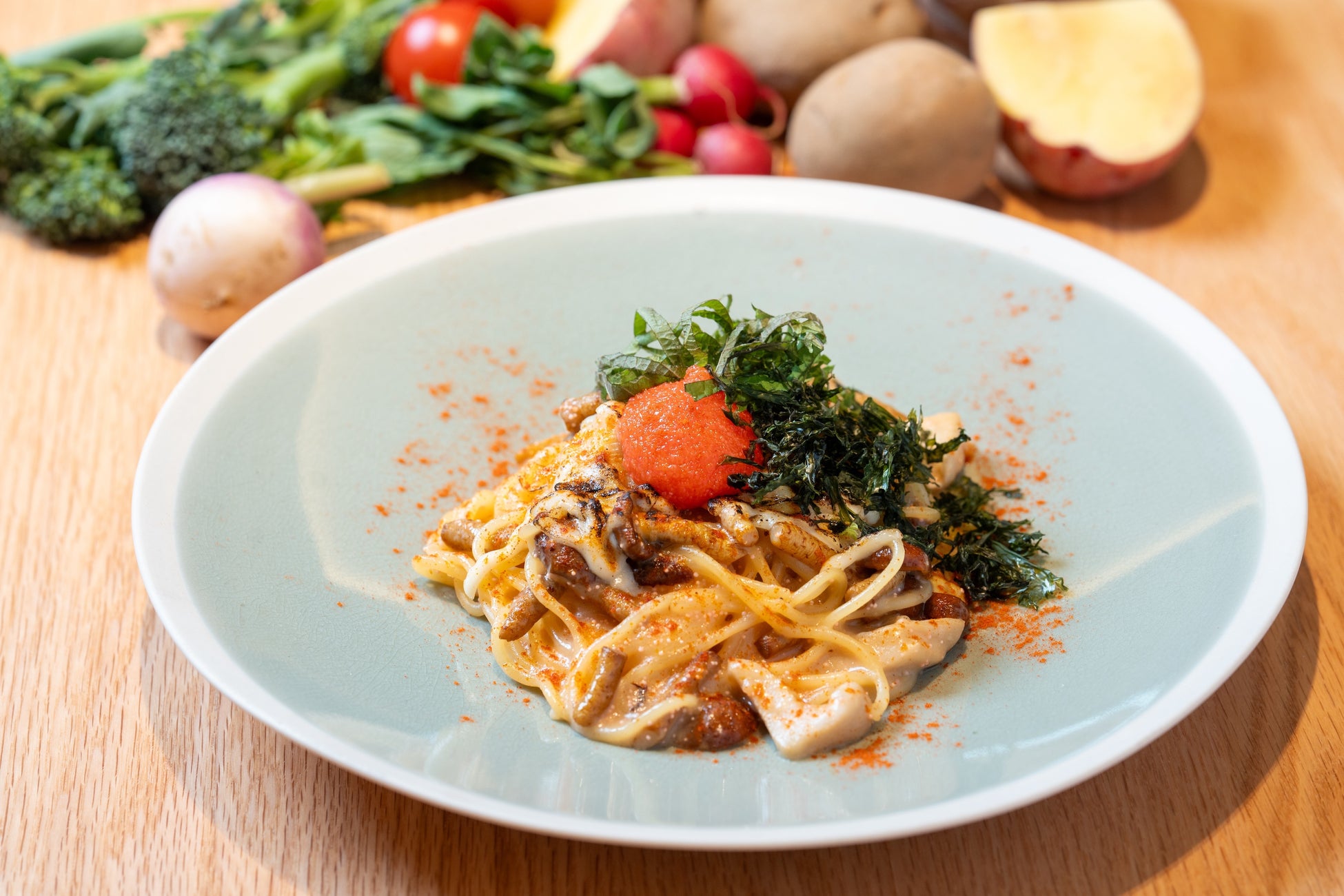 ラチーズと有明産の海苔とご⼀緒に召し上がることで、より茸の⾵味を感じて頂けます。また⽣パスタのもっちりとした⾷感で、明太⼦や茸といった様々な味わいを楽しんで頂ければと思います。