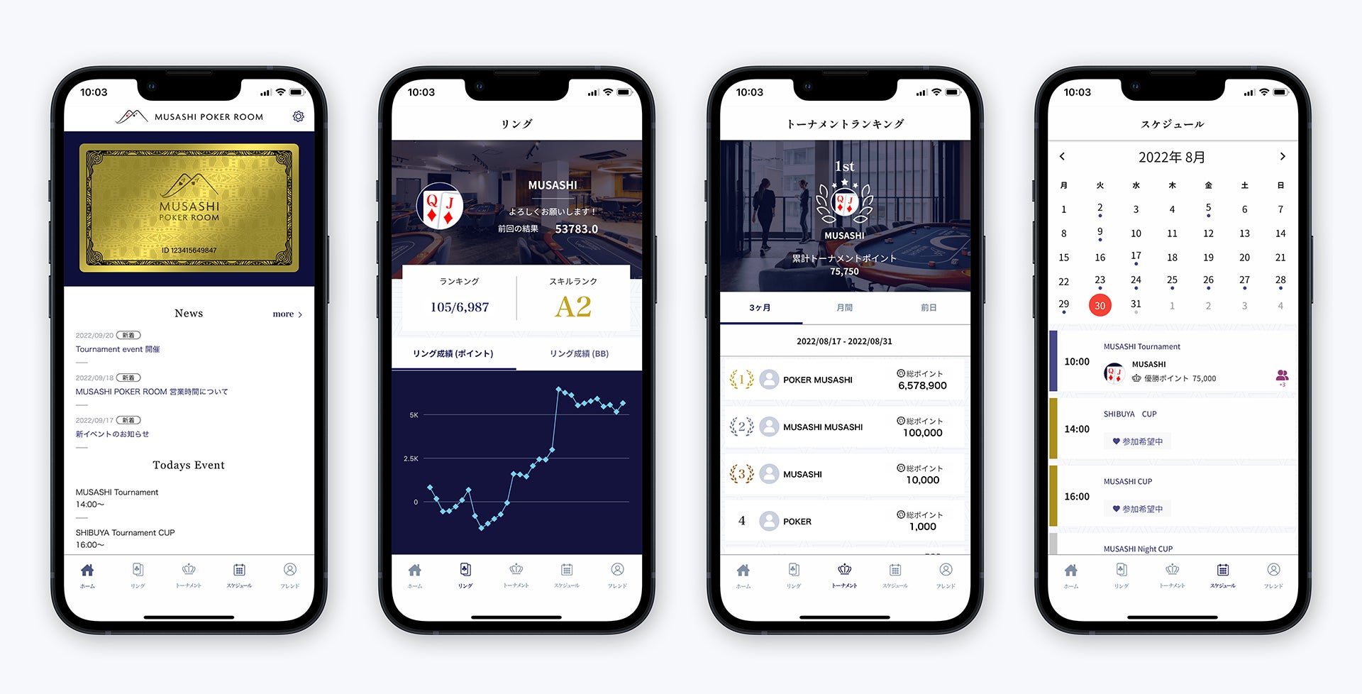一方、MUSASHI社は、2022年9月10日より実店舗となる「MUSASHI POKER ROOM」をオープンいたしますが、これに先立ち、当社のこれまでのアプリ開発や運営ノウハウと実績を評価いただき当該アプリの開発及び保守業務の受注を当社が引き受け、このたび本アプリサービス開始に至りました。