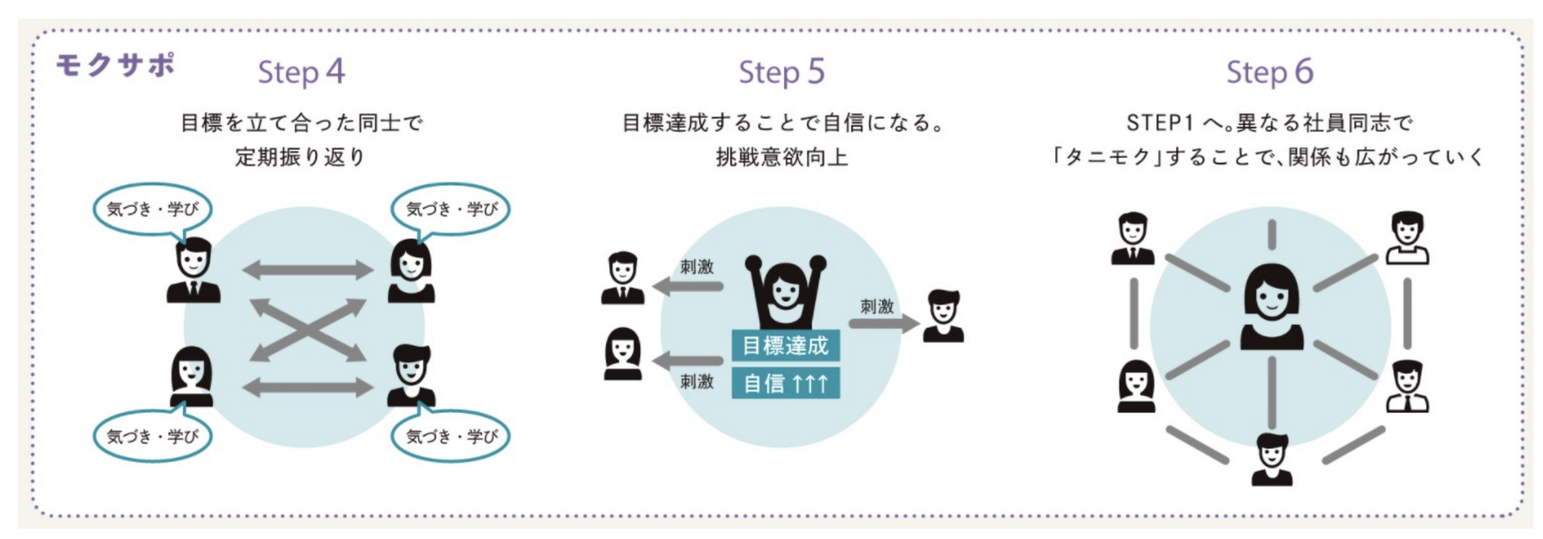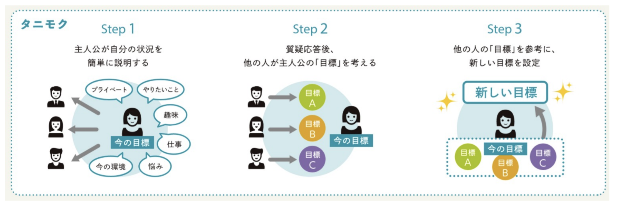 このプロジェクトは、3~4人一組で他人の目標をたてるタニモクと目標をサポートするモクサポを通じて、自分ひとりの頭では思いつかない目標を実現していこうという試みです。
