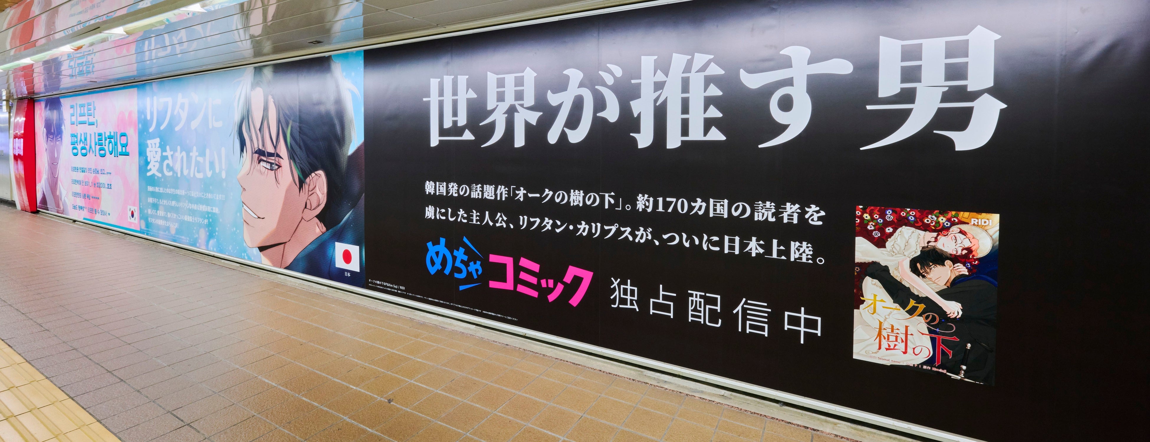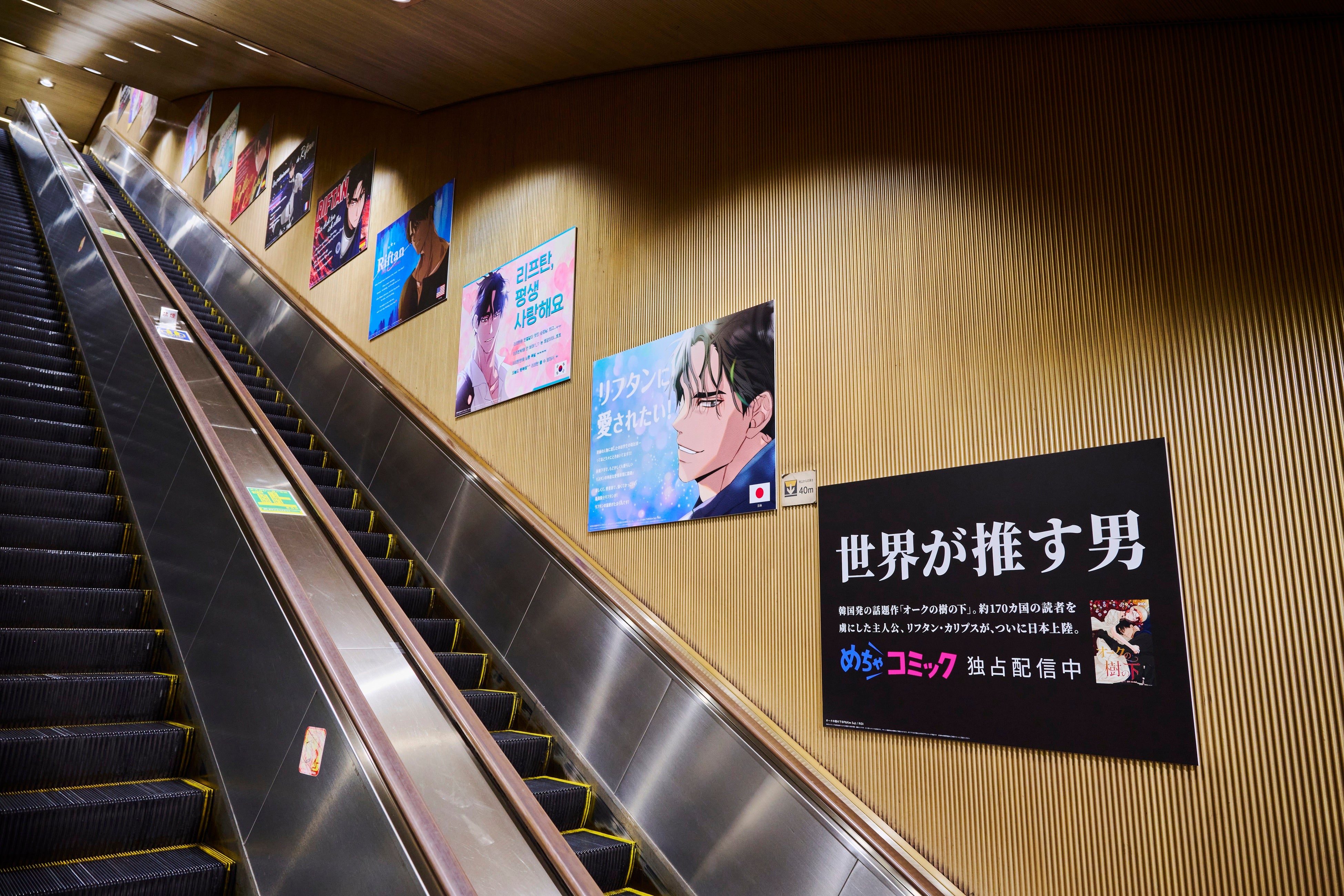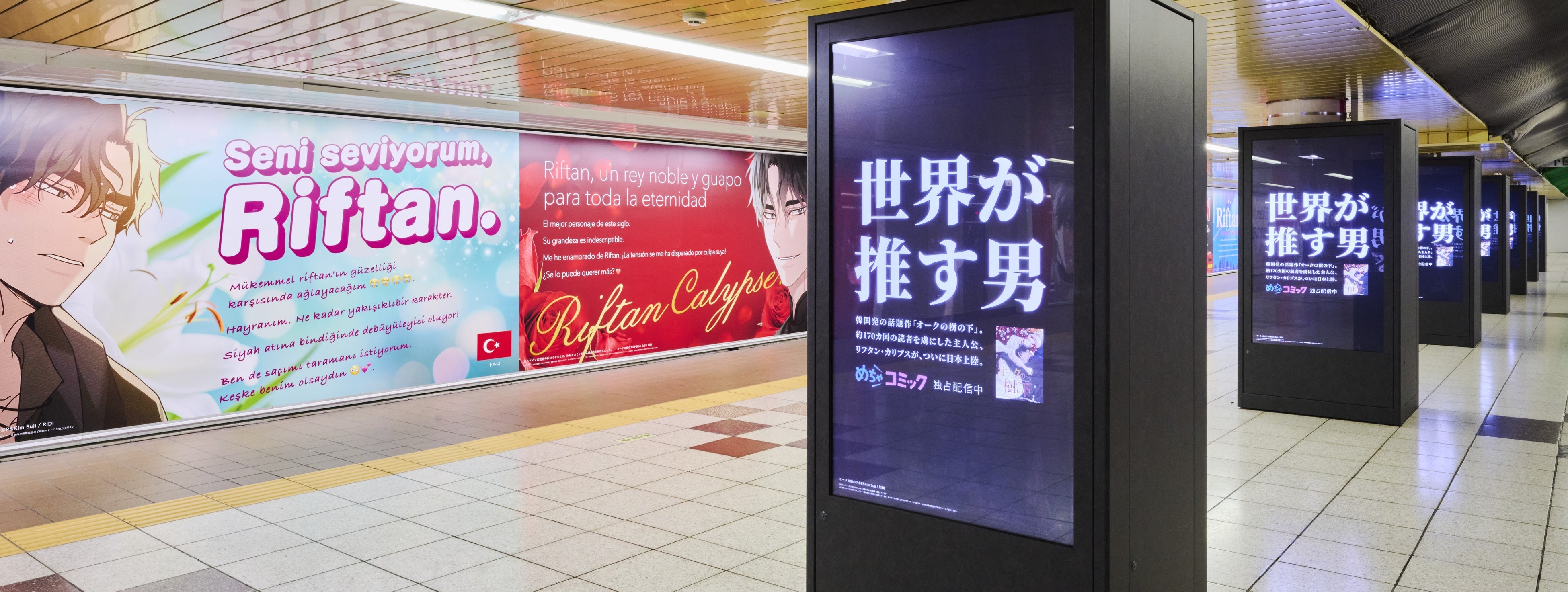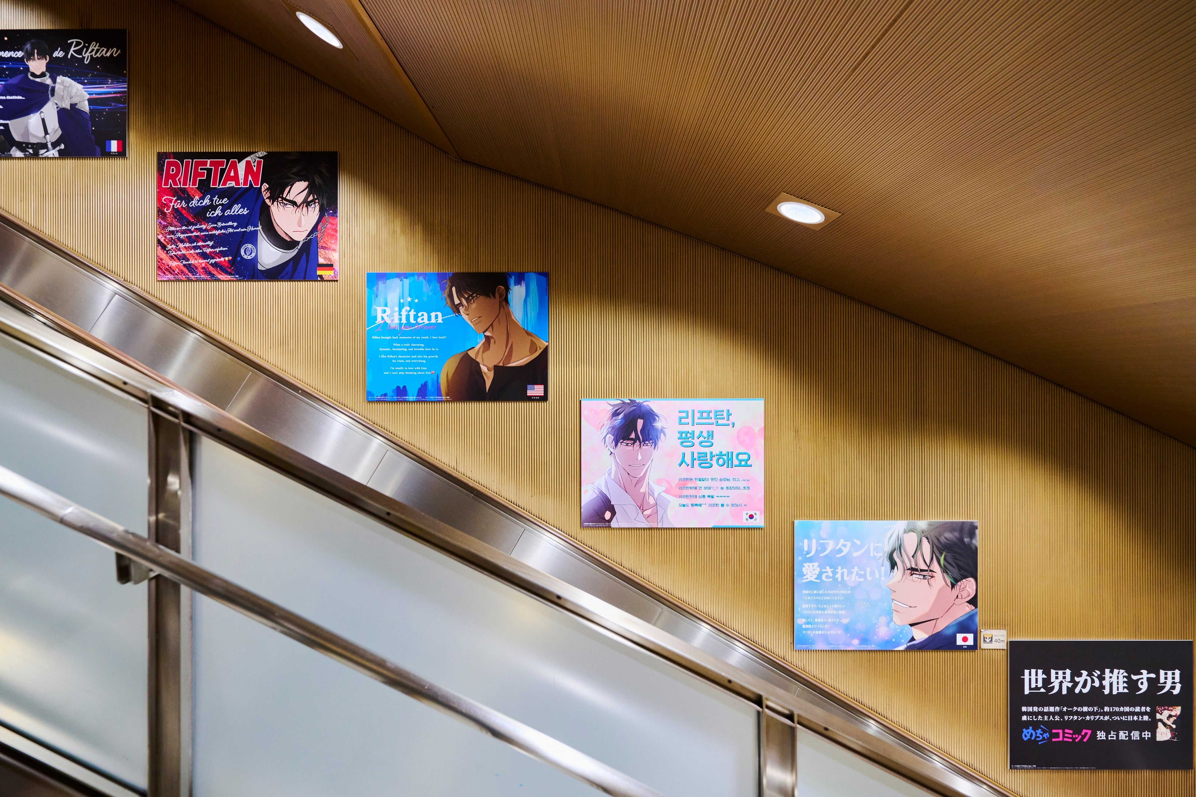韓国発の本作にちなんで、韓国の”推し文化”である「応援広告(通称:センイル広告)」を模したデザインで、日本をはじめとする世界10か国の読者の実際のレビューをもとに、主人公「リフタン・カリプス」への「応援広告」として制作しました。東京メトロ丸ノ内線「新宿駅」のメトロプロムナード約80mの広告ジャックをはじめ、都営大江戸線「六本木駅」のエスカレーターと京王井の頭線「渋谷駅」の改札をジャックします。