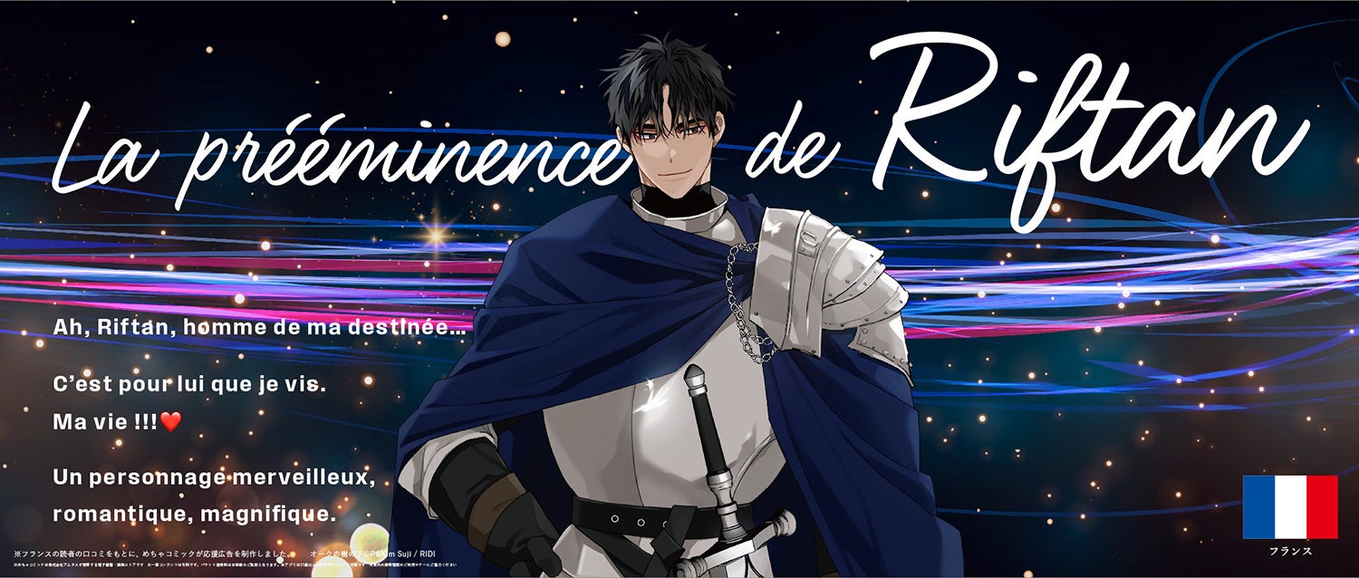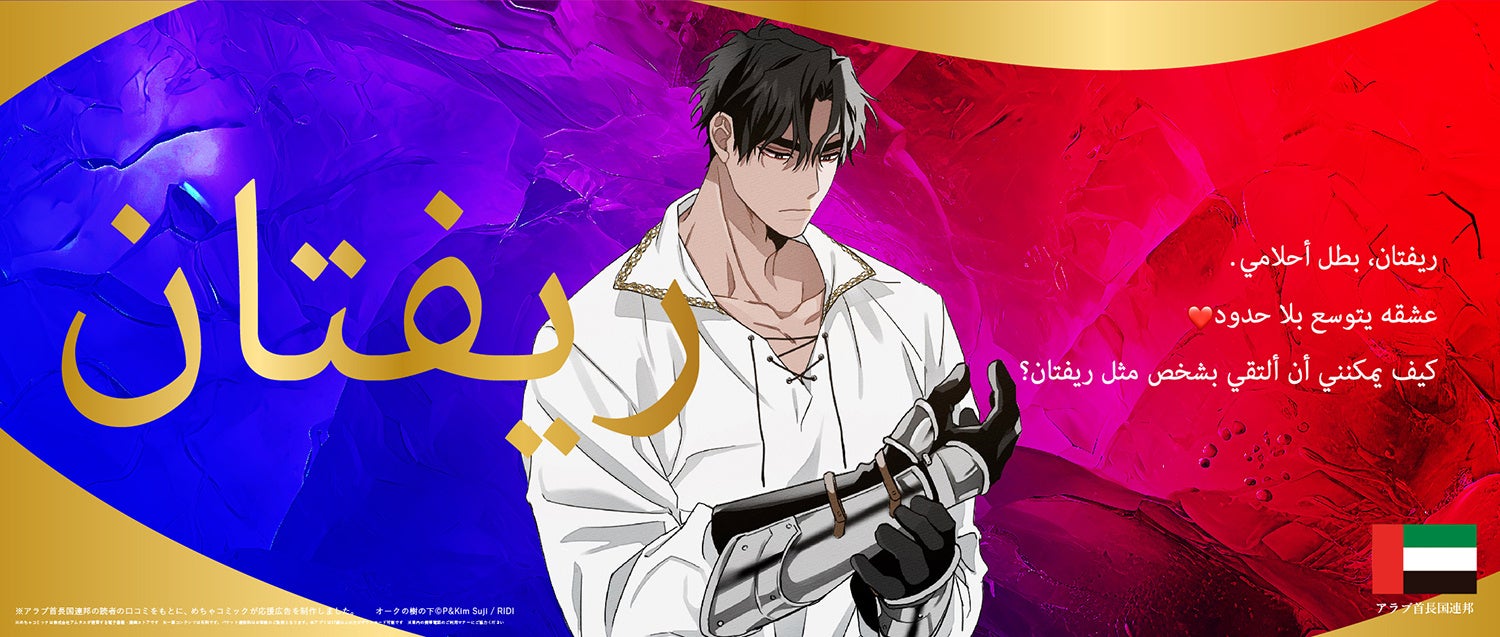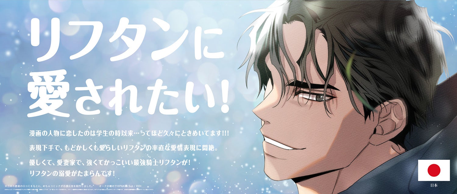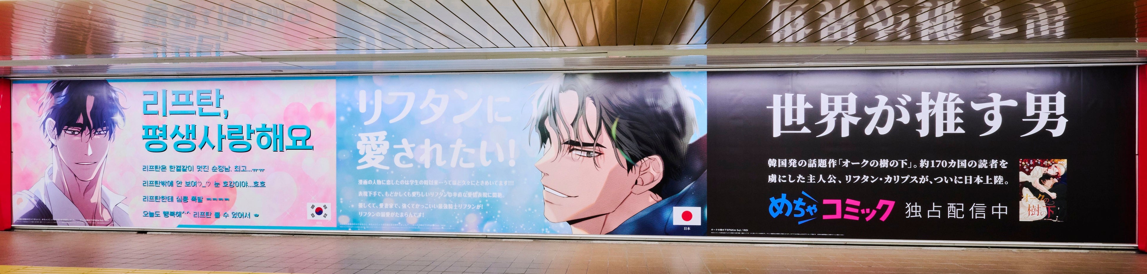 屈強で闘志あふれる騎士リフタンが、一途に妻のマクシミリアンを愛する姿に対して、世界各国の読者から憧れと共感の声が寄せられ、日本でも配信直後から熱量の高い口コミが多数集まりました。今回のプロモーションでは、こうした世界10か国の読者による、リフタンを“推す”熱烈な声をもとに、当社が「応援広告」として制作し、新宿駅、六本木駅、渋谷駅という都心の三駅で大きく展開することで、世界的な話題作でありながら、日本に上陸したばかりの「オークの樹の下」の魅力を伝えます。