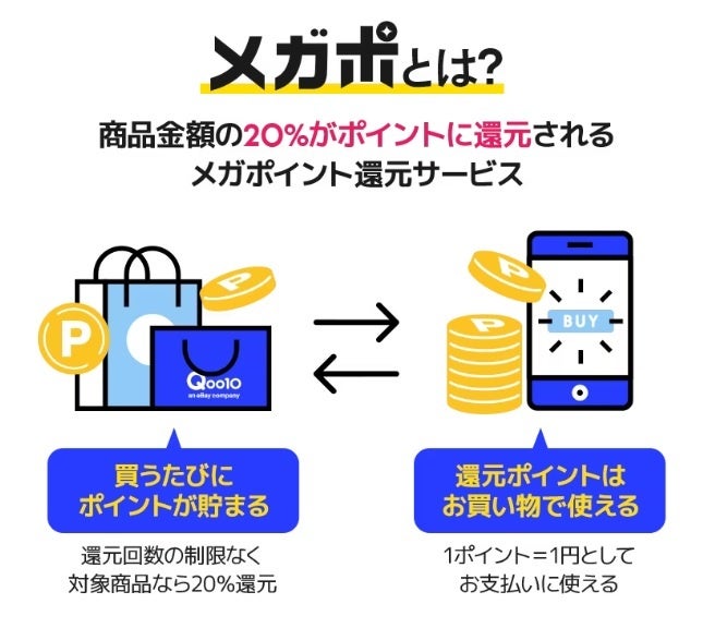 値上げが続く2023年春は、ポイントを貯めて賢くお買い物する「ポイ活」が今まで以上に注目されています。そこで、Qoo10では、ポイントが貯まる楽しみを感じていただきながら、お得にショッピングできるメガポイント還元サービス「20%メガポ」をご用意しました。還元回数に制限はなく、対象商品の全てが20%ポイント還元(1商品につき最大2万円)となります。還元ポイントは1ポイント1円として、商品到着の8日後に還元となり、その後はQoo10での支払いにご使用いただけます。