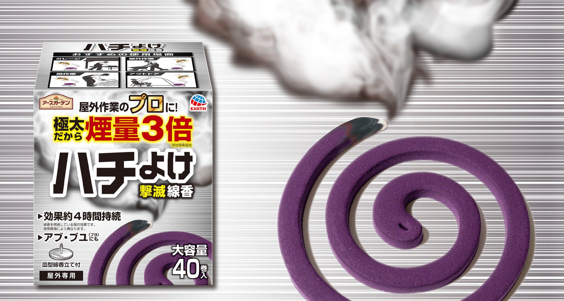 当社はお客様の「予防(忌避)ニーズ」に応え、屋外作業時のハチに対する不安から解放され、快適に過ごせるよう「アースガーデン」ブランドから、強力な忌避効果を持つ線香タイプを新提案します。