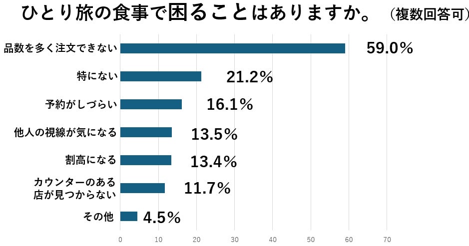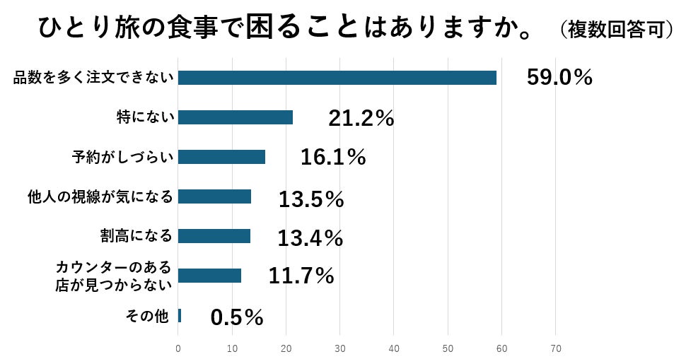 家族や友人たちと出かける旅行とは違い、ひとり旅ならではの食事の苦労も。最も多く挙がったのが「品数を多く注文できない」といった意見。地元の物を多く楽しみたくてもひとりだと限界が。他には予約がしづらい、他人の目が気になる、割高になる、といった意見も。