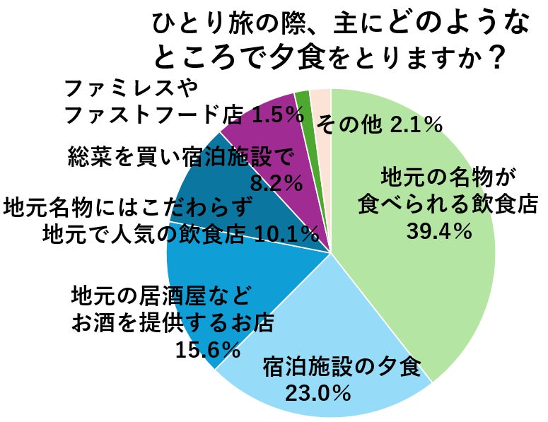 ひとり旅の夕食時に、どんなところに行くのかも伺いました。最も多かったのは「地元の名物が食べられる飲食店」で40%程の方が回答。やはり地の物を食べるのは旅の醍醐味のようです。