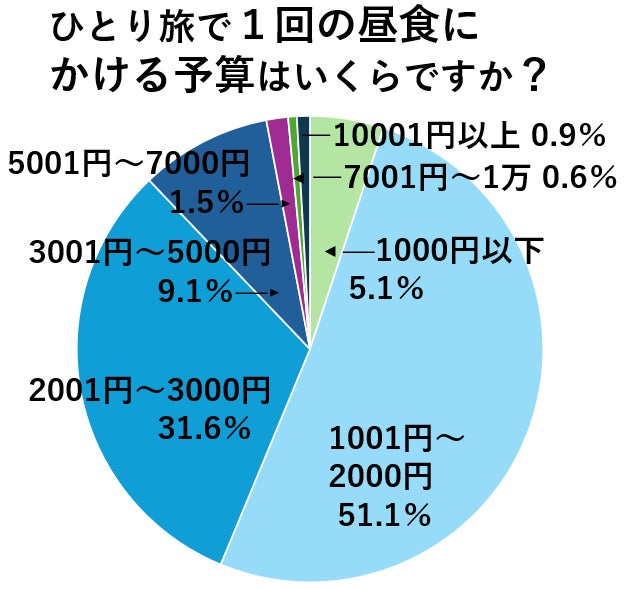 まずは、ひとり旅時の昼食にかける費用について。もっとも多かったのは1001~2000円の範囲、次いで2001~3000円の間という回答でした。ひとり旅に出かけた時は、普段と変わらないか気持ち多めといった印象で、ノジュール読者が旅慣れていて、賢く食事を楽しむ様子が伺えました。