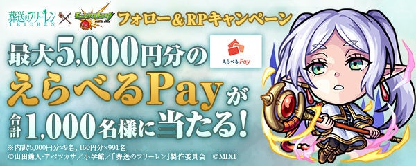 モンストキャンペーン公式Xアカウント(https://twitter.com/monst_campaign)をフォローし、対象の投稿を期間内にリポストすると、えらべるPay 最大5,000円分が抽選で合計1,000名様に当たります。