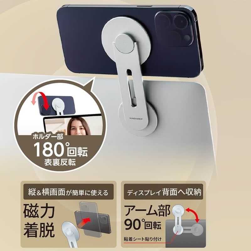 “AMS-DSMARMDSV”は、MacBookなどのノートパソコンのディスプレイ背面に取り付けることで、iPhoneスタンドとして使えるマグネット式のディスプレイアームスタンドです。iPhoneをサブディスプレイやWebカメラ(※2)として使えます。前後に180°回転可能で、画面側とメインカメラ側を簡単に切り替え可能です。未使用時はスタンドをディスプレイの背後に収納することができます。