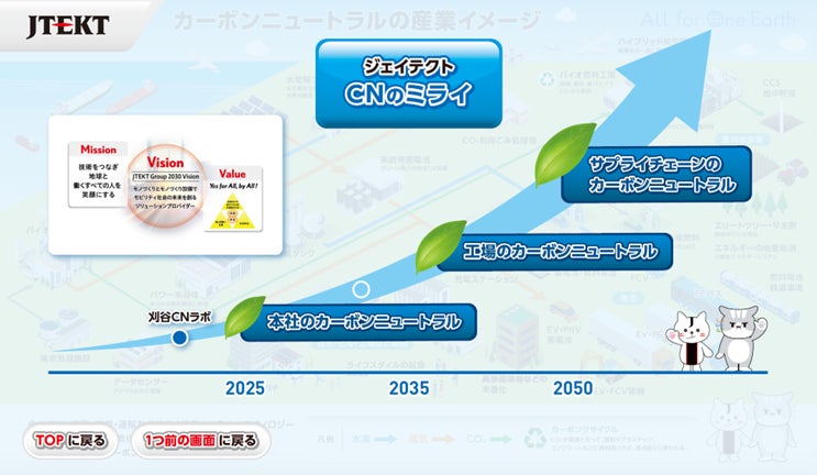 を目指しています。その中で生産活動(SCOPE 1, SCOPE 2)での排出量は、2035年までの達成を宣言しています。本展示会では、カーボンニュートラルの実現に向けた取組み(グリーンエネルギーの導入、水素の地産地消、省エネルギー技術、など)を大型タッチモニターでご紹介します。ジェイテクトが描くCNのミライをぜひご体感ください。