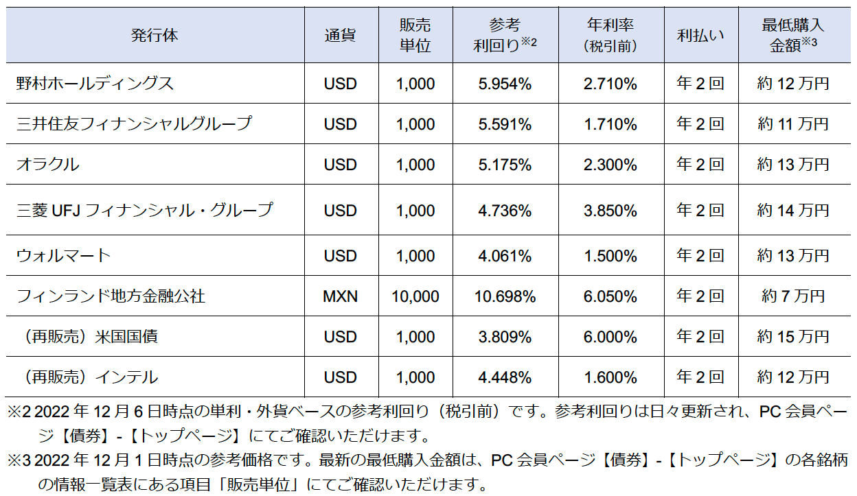 ※2 2022年12月6日時点の単利・外貨ベースの参考利回り(税引前)です。参考利回りは日々更新され、PC会員ページ【債券】-【トップページ】にてご確認いただけます。