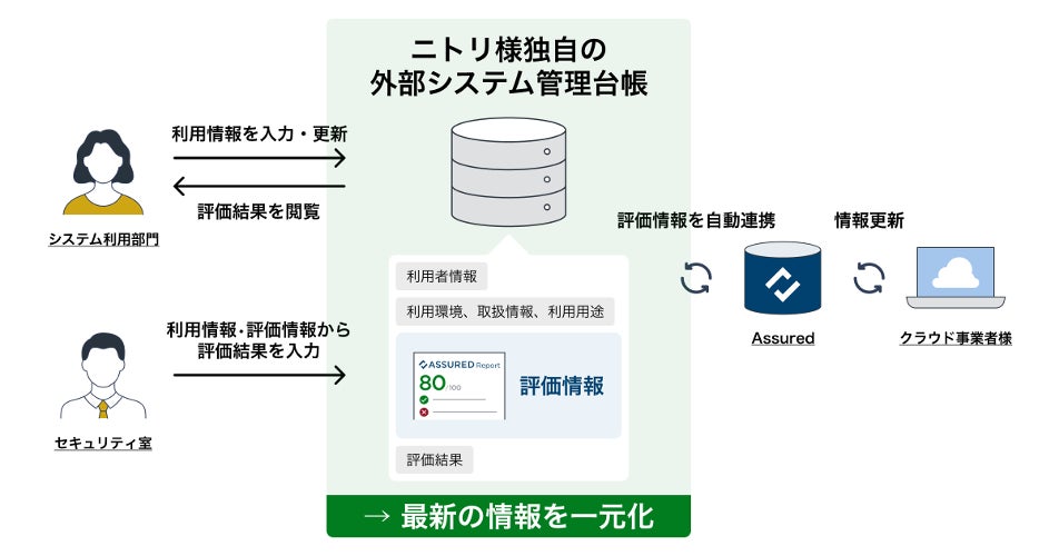 また、ニトリ様においては、単にサービスを導入いただくだけでなく、自社で新設された管理台帳にAssuredを自動連携いただき、独自の管理体制にAssuredを組み込んでいただくことになりました。この取り組みにより、同社の課題解決により一層寄与できればと存じます。