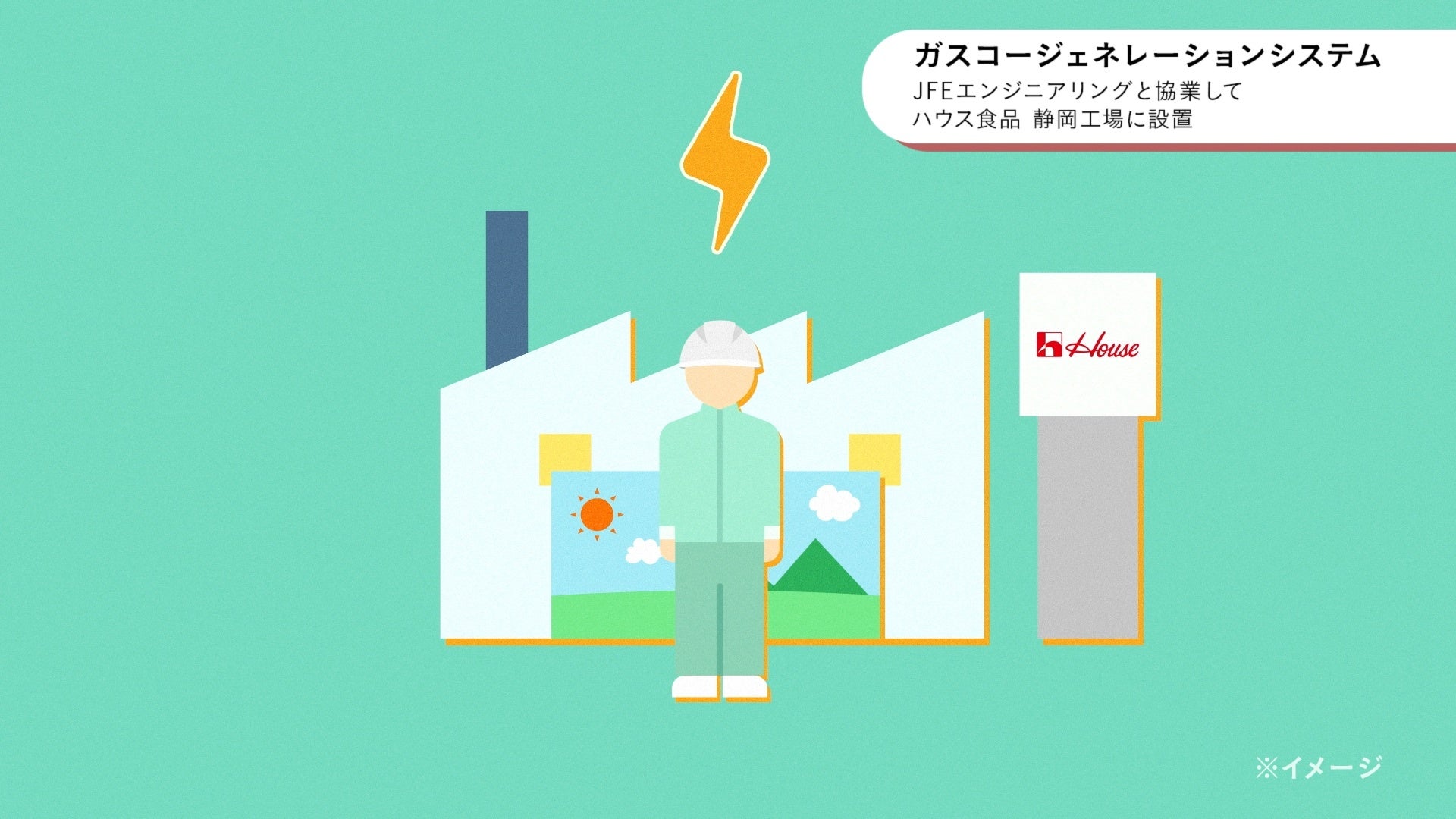 今回のTVCM「広がるCO2削減の取り組み」篇では、ハウス食品の工場に発電施設「ガスコージェネレーションシステム」を設置し、発電した低CO2電力をハウス食品グループの国内関係会社・事業所に融通する、JFEエンジニアリング株式会社提供システム「多拠点⼀括エネルギーネットワークサービス」(※)を、「ハウス食品グループ長期環境戦略2050」実現に向けた代表的な事例として紹介いたします。
