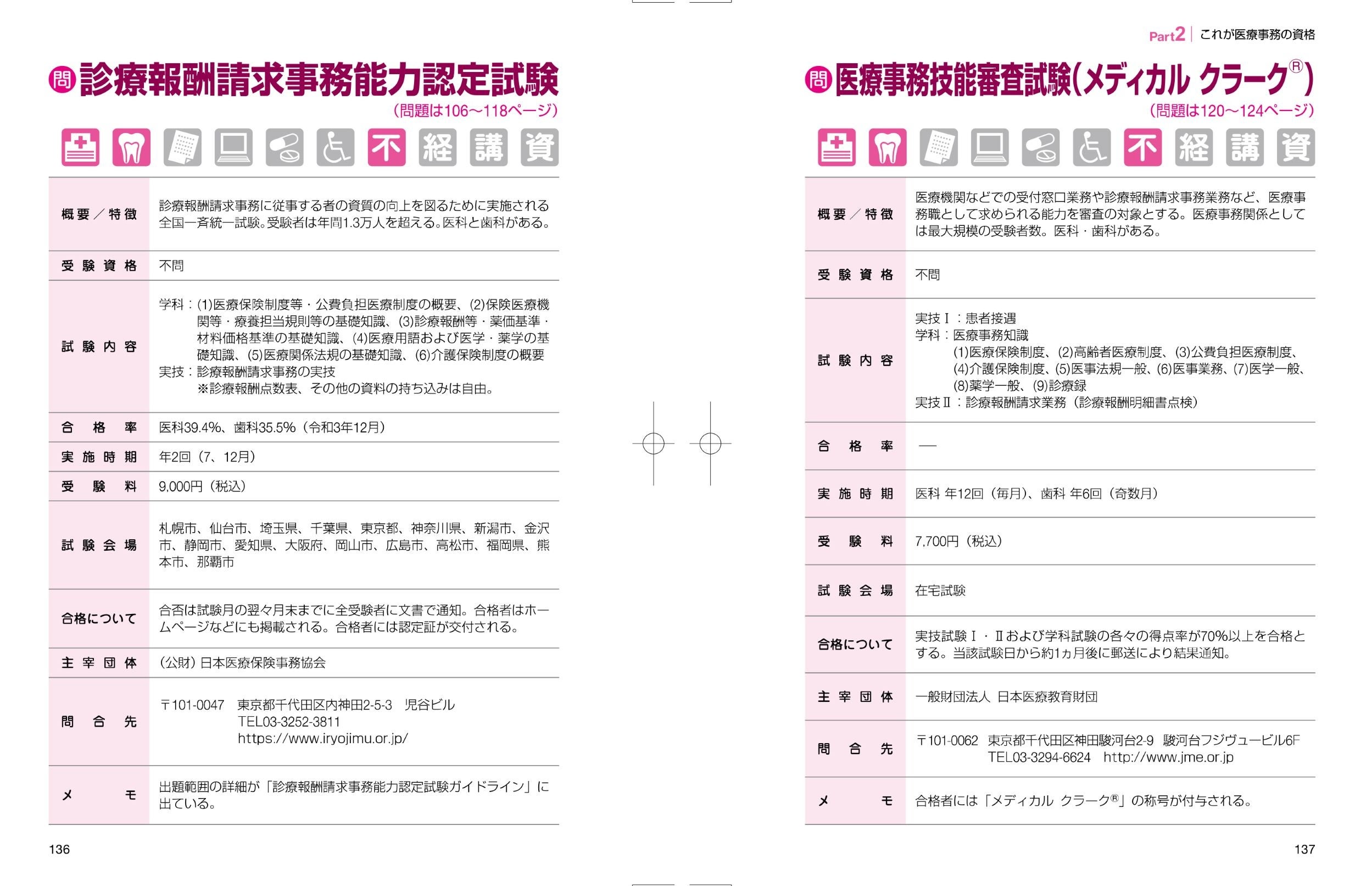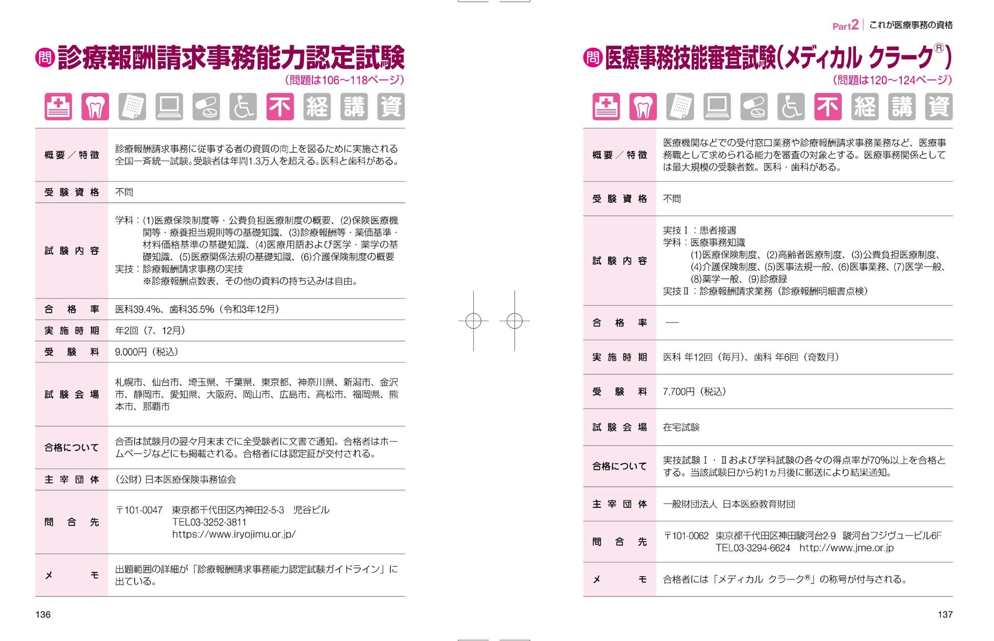 また、この本では、30種類以上、代表的なものだけでも10種類近くある医療事務の資格を、目的別に内容を紹介、さらに実際の試験問題(抜粋)と解答を紹介しています。