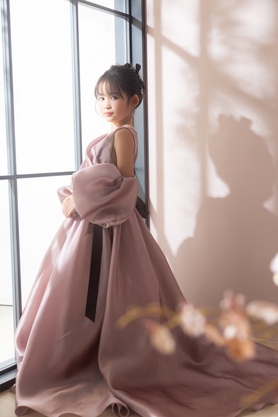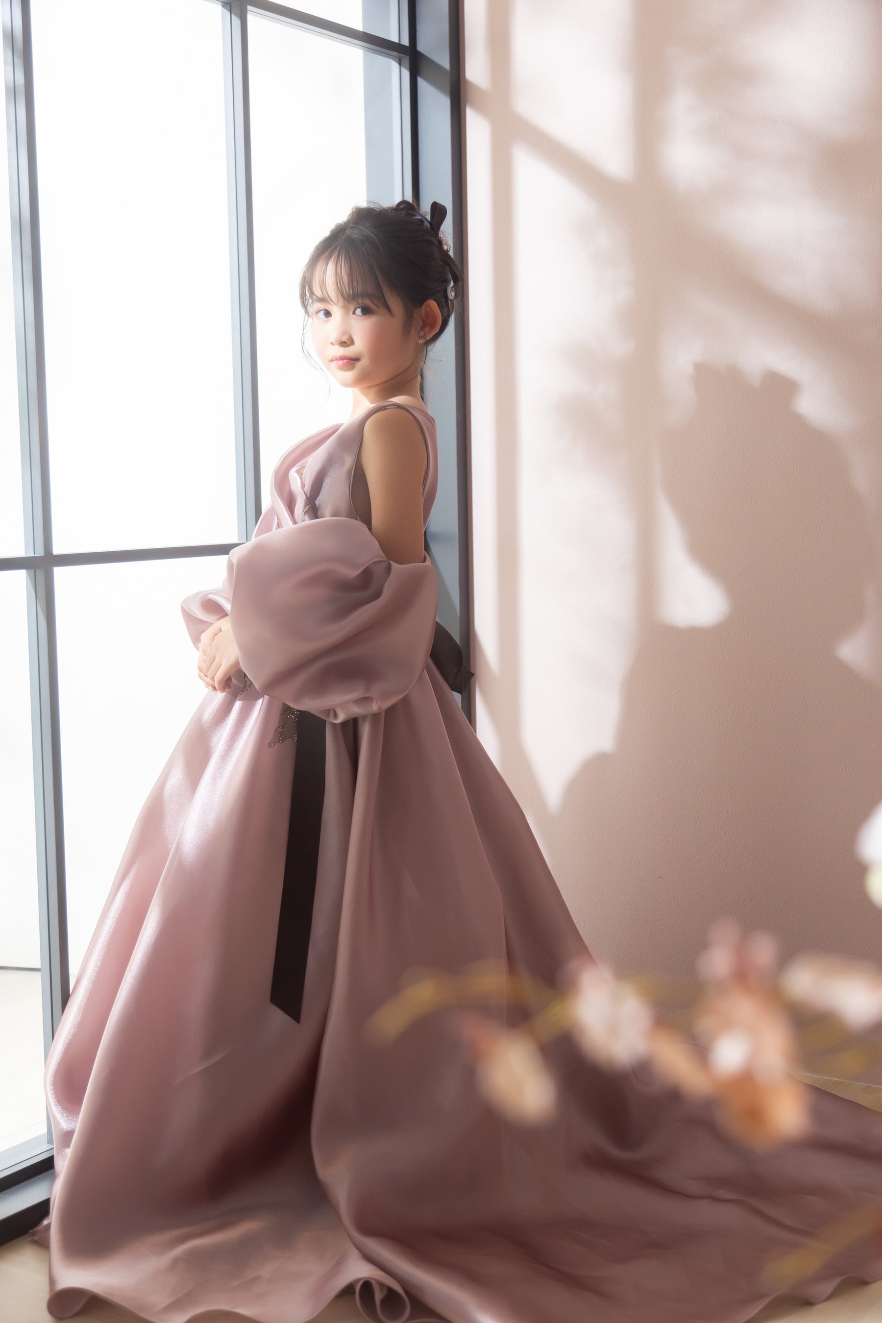大人顔負けな光沢感のあるリッチなドレスにざっくりとアップのまとめ髪にちょっと薄めの前髪で抜け感を。