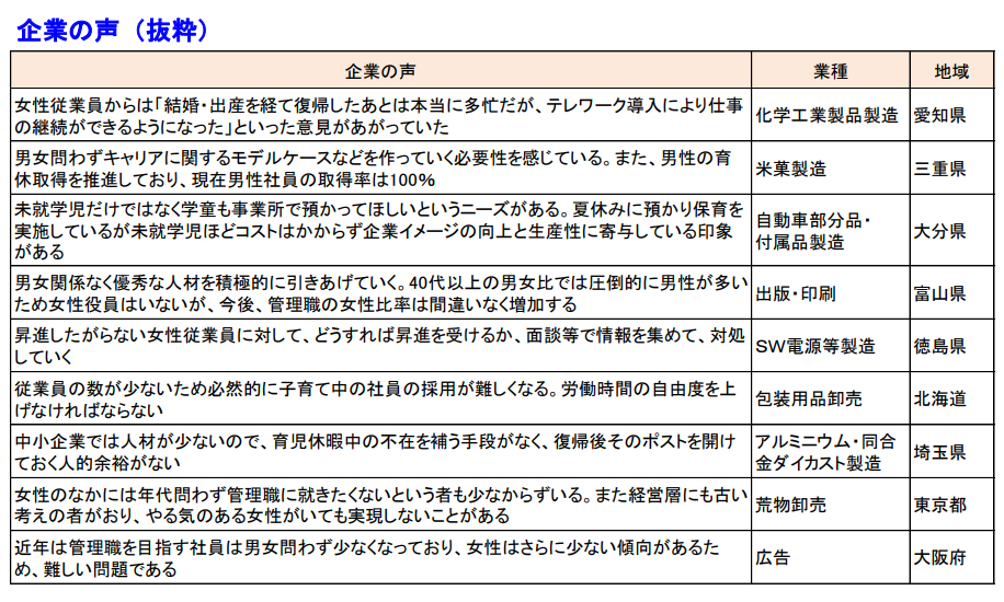一方で「子育てしながら働ける環境が必要と思うが、中小企業は資金面で難しい」(機械設計、静岡県)や「能力があれば性別を問わず登用したいが、女性は出世に慎重で管理職になりたがらない。会社全体で意識を変えていかなければならない」(化学工業製品製造、静岡県)といった声にあるように、課題を抱えている企業も依然として多い。