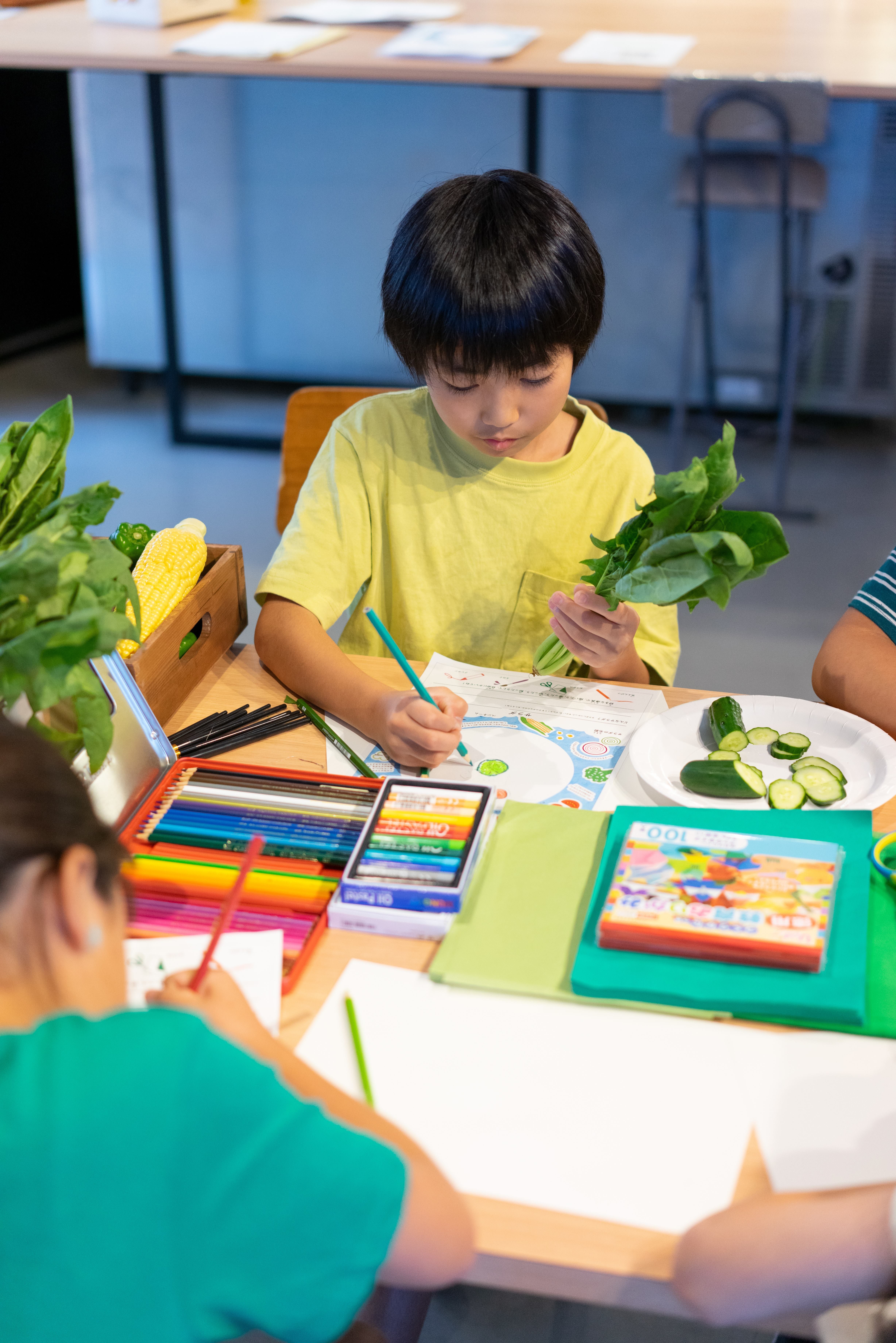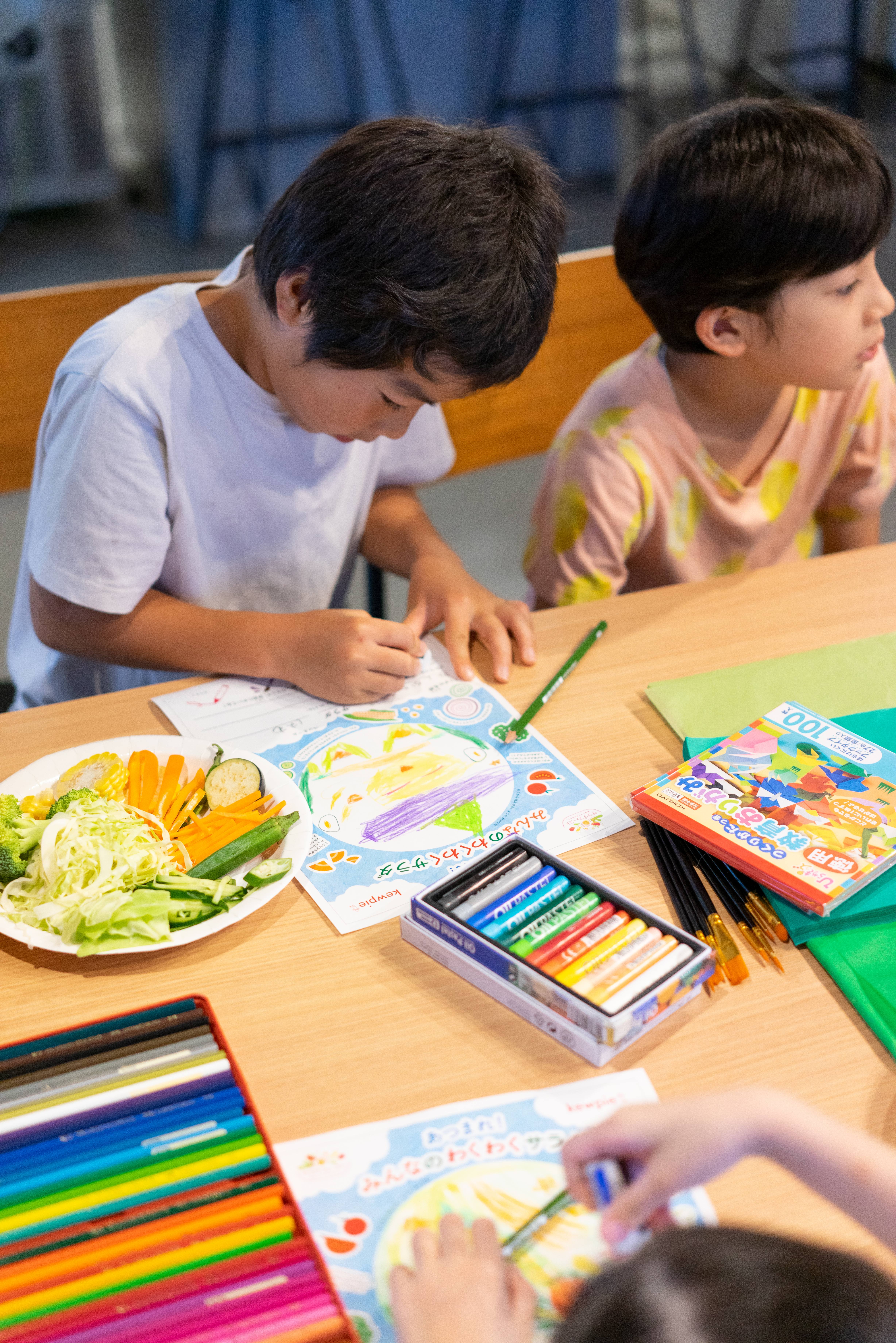 さまざまな野菜の色や形を組み合わせて、自由な発想で描いてみよう!