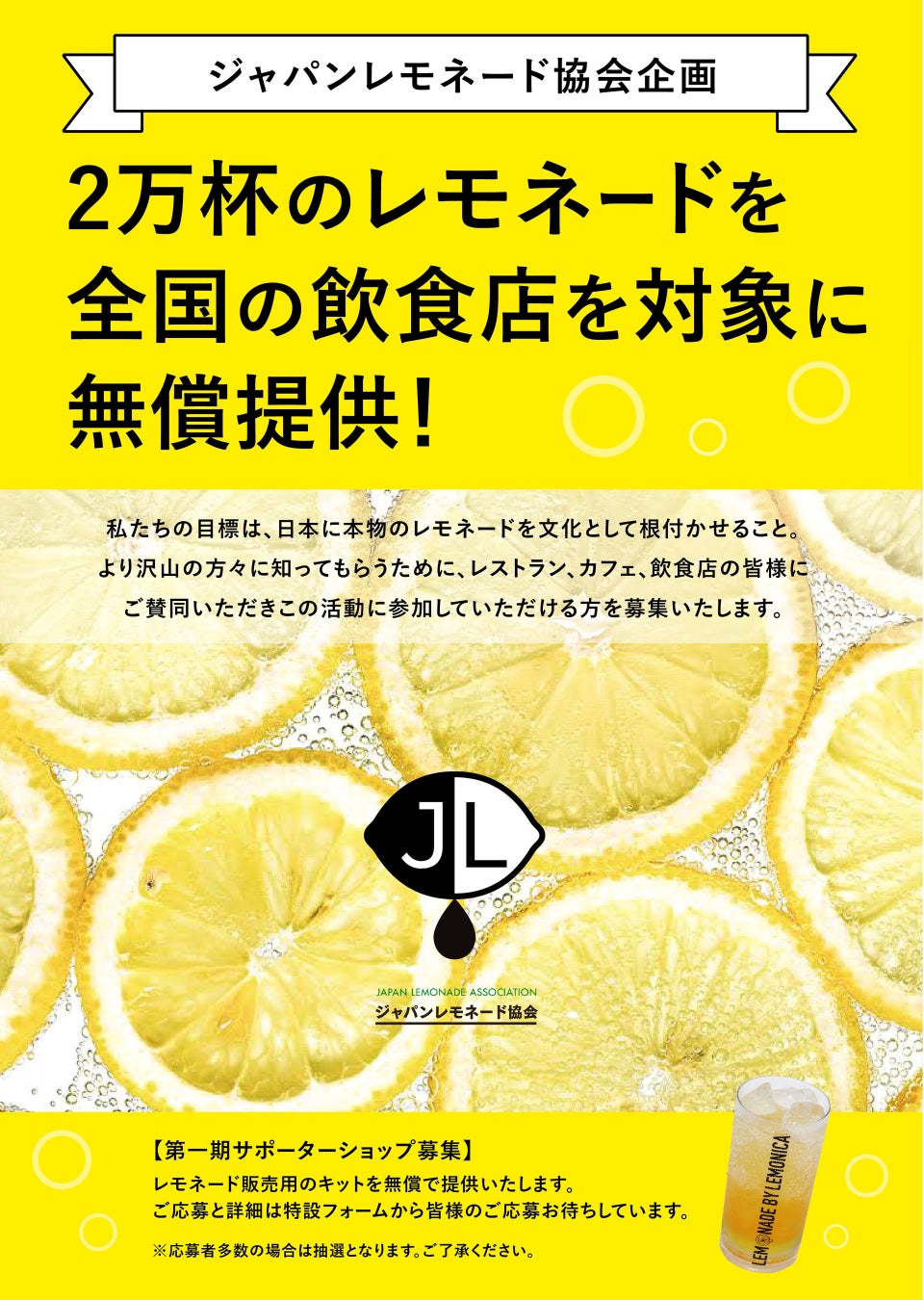 7月7日(木)より、全国の飲食店を対象に、JLA認定のレモネードシロップを含む専用キットを無償提供し、より沢山の方々にレモネードを知ってもらうためのキャンペーンを開催します。飲食店は夏の季節メニューとしてレモネードの提供をすることができます。この活動に賛同していただけるサポーターショップを募集します。