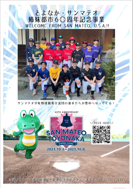 豊中市は、今年サンマテオ市との姉妹都市提携60周年を迎えるにあたり記念事業を開催します。同事業では10月3日(火)から10月9日(月祝)までサンマテオ市長や少年野球親善交流団が本市に滞在し、記念式典や植樹式など、一般参加が可能なイベントを開催し、市全体で60周年の節目を盛り上げます。