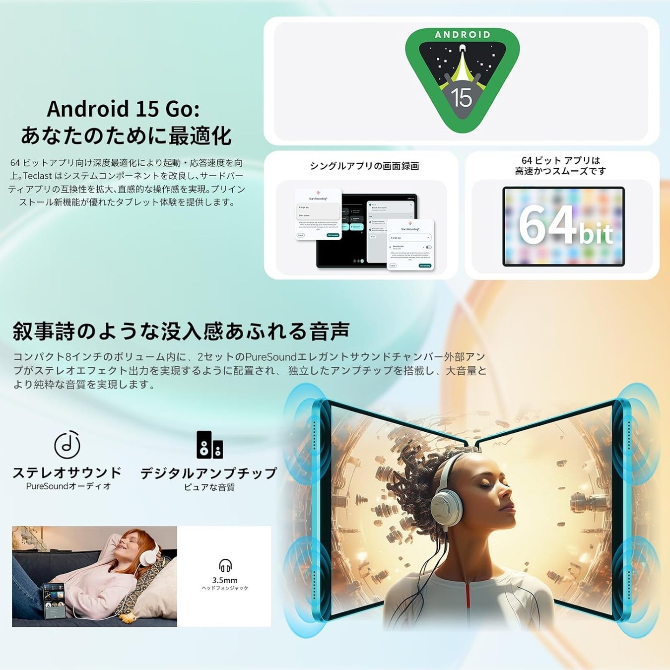 【タブレット Widevine L1認証 & 無線投影 】TECLAST Android 15 GO タブレット8インチ は、快適なIPSインセルディスプレイ、1280*800の高解像度、ビデオコンテンツの視聴に快適な16:10の画面比率、よりリアルな視聴体験のために鮮明で明るい画像を提供する鮮やかなワイドスクリーンディスプレイを備えています。