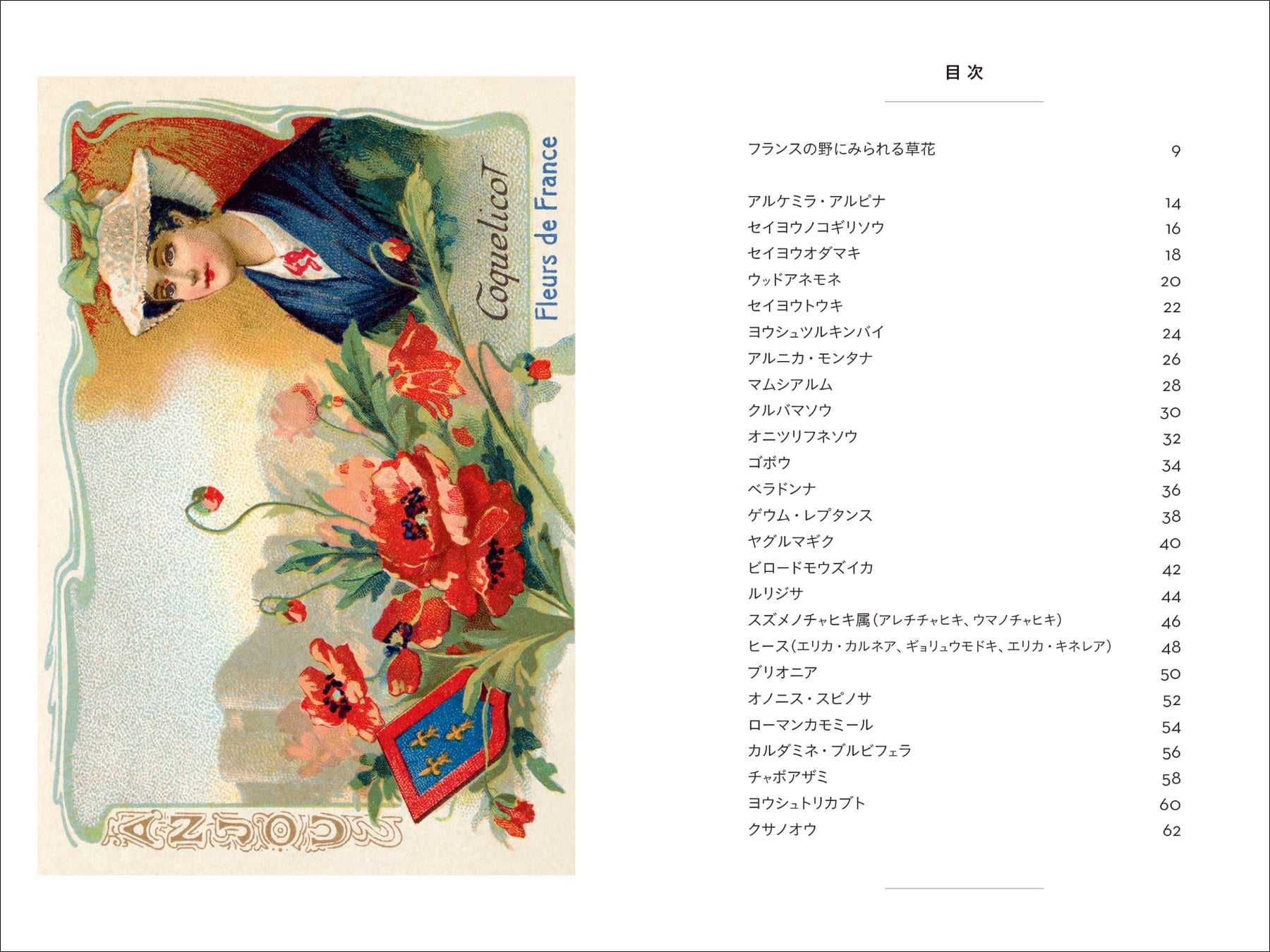 牧草地、川の岸辺、⼭道など、フランスの野に咲く草花をクロモカードとともに紹介するレトロな植物事典