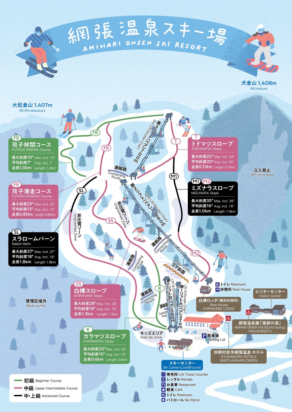 第3リフト山頂駅は岩手県内最高所のゲレンデで、山頂駅からは西に八幡平、東に岩手山までツアースキーエリアとなっています。ゲレンデ中間付近に滑りごたえのある急斜面、上部は厳冬期に樹氷も見られる林間コース、下部は広々した初級~中級の斜面となっています。