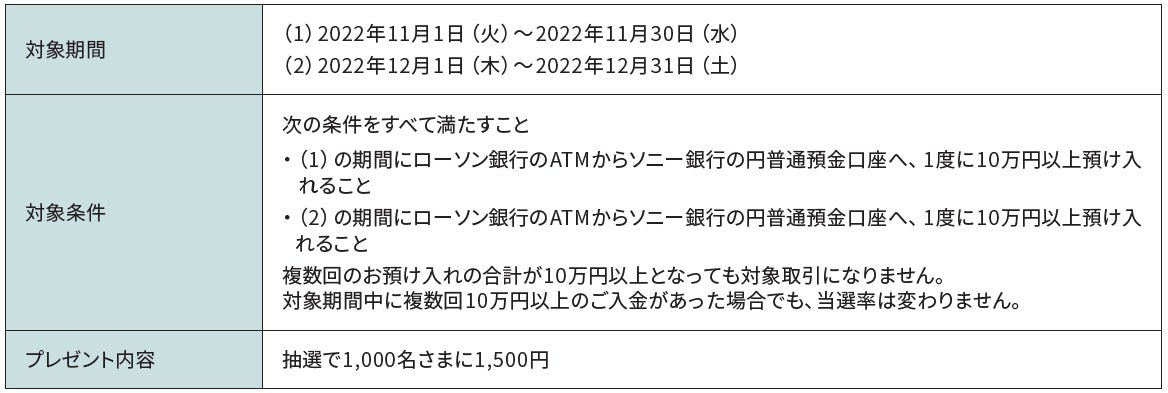 ソニー銀行株式会社(代表取締役社長:南 啓二/本社:東京都千代田区/以下 ソニー銀行)は、2022年11月1日(火)より、「ローソン銀行ATMから2ヶ月連続で10万円入金しよう!」キャンペーンを実施しますので、お知らせいたします。