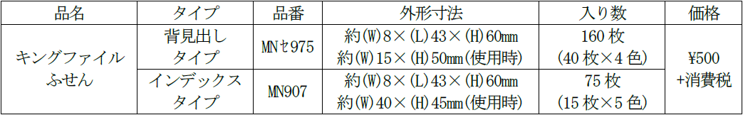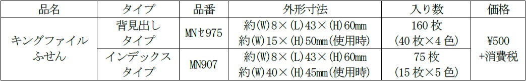 「キングファイルふせん」は、キングジムのロングセラー製品キングファイルがモチーフのふせんです。小さなキングファイルの中にふせんが入っており、背見出しタイプとインデックスタイプの2タイプをラインアップしています。