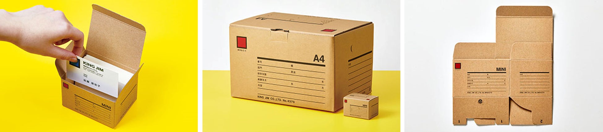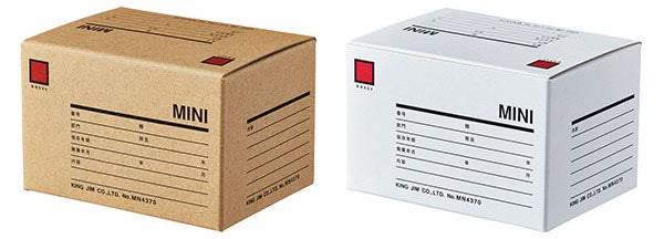 「ミニ保存ボックス」は、キングファイルをそのまま収納できるボックス「保存ボックス」をイメージした小さな収納ボックスです。名刺がぴったり入るサイズなので名刺の収納はもちろん、デスク周りの小物の整理にもおすすめです。組み立て式のため、使わない時はフラットに畳んでおくこともできます。カラーは茶色と白の2色展開で、デスクの雰囲気や収納物によって色を選べます。