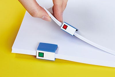 「キングファイルクリップ」は、オフィスのスタンダードファイルとして親しまれているキングジムのロングセラー製品キングファイルの形をしたミニクリップです。つまみ部分を引き出してから挟むスライドクリップ形状を採用しており、枚数の多い書類も力を入れずに綴じることができます。キングファイルでもおなじみの、背表紙についた4色のスクエアパターンで書類の分類も可能です。