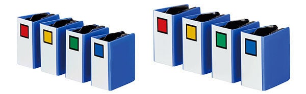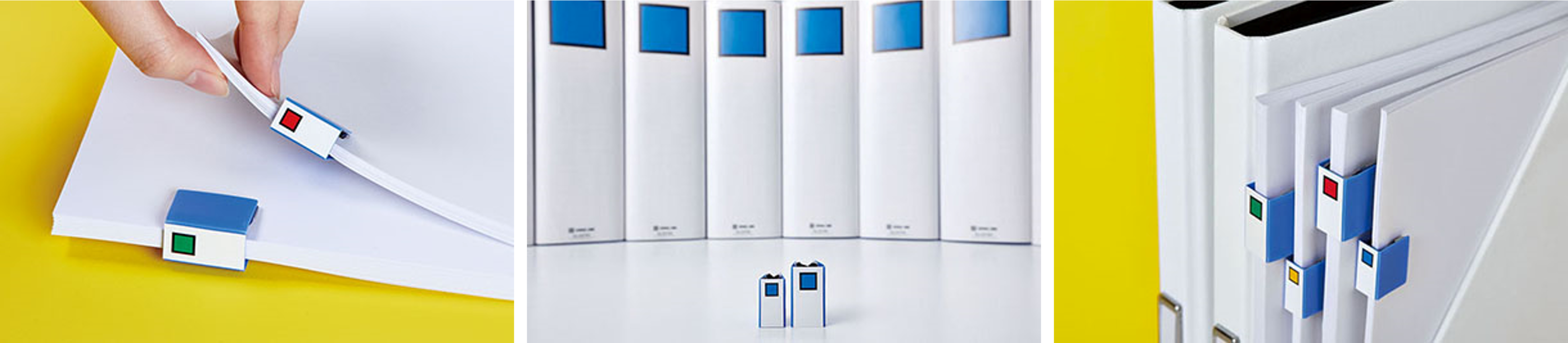 サイズは約60枚の書類が綴じられるMサイズと、約90枚の書類が綴じられるLサイズの2サイズをラインアップ。それぞれ赤・黄・緑・青のスクエアパターンが1色ずつ入った4個セットです。