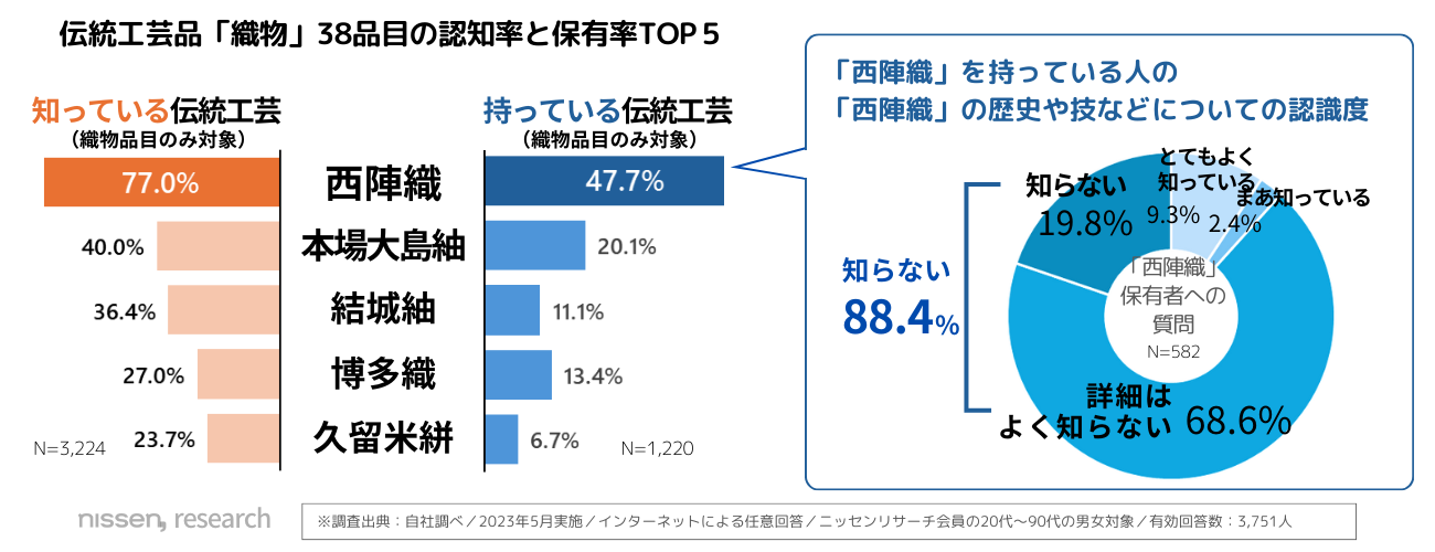 経済産業大臣の指定を受けている工芸品のうち、「織物」に分類されている38の工芸品(2022年11月時点)について認知度と保有率を調査したところ、いずれも「西陣織」が1位でした。じつに、回答者の7割以上が認知しており、48%の人が「西陣織」を持っていると回答。しかし「西陣織」の歴史や技など「詳細については知らない」という人が、保有者の8割以上を占める結果となり、認知されているのは、名称だけということが明らかになりました。