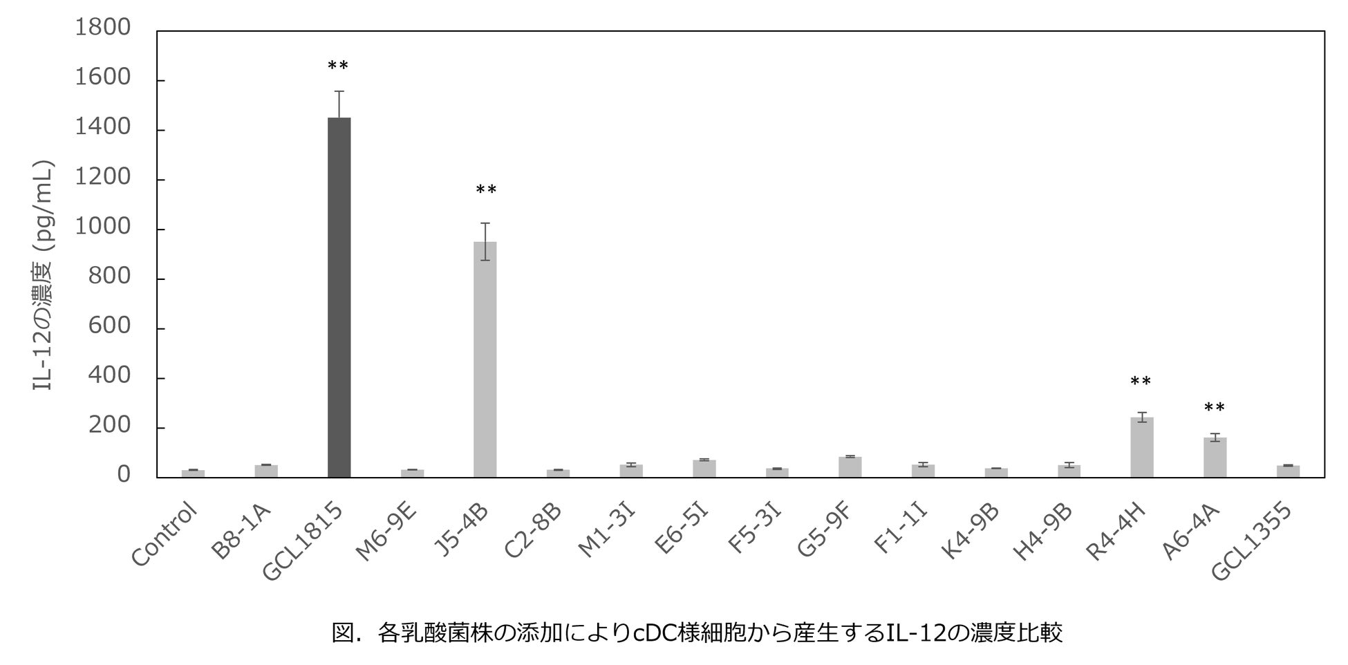 その結果、15株中4株は対照群よりも有意に高いIL-12濃度を示し、GCL1815株は対照群よりも45倍以上高い、強力なIL-12産生誘導を示しました(図)。