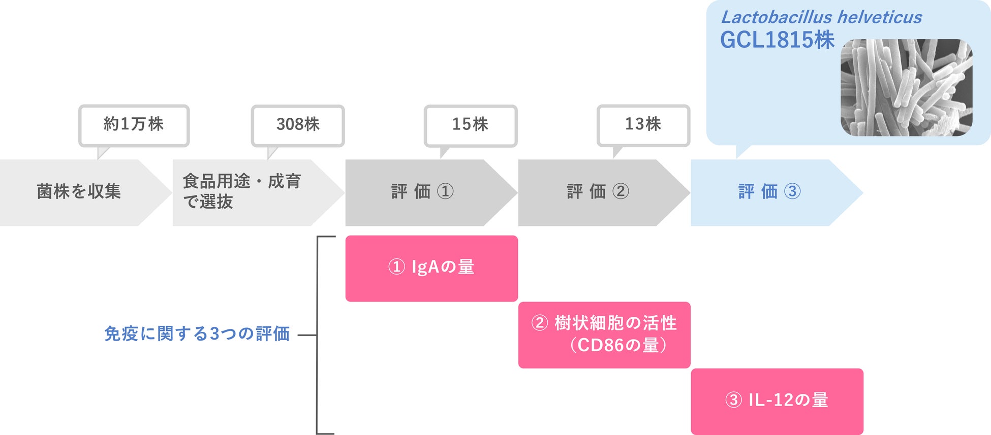 3つの免疫評価から最有力の乳酸菌を発見 Lactobacillus helveticus GCL1815株