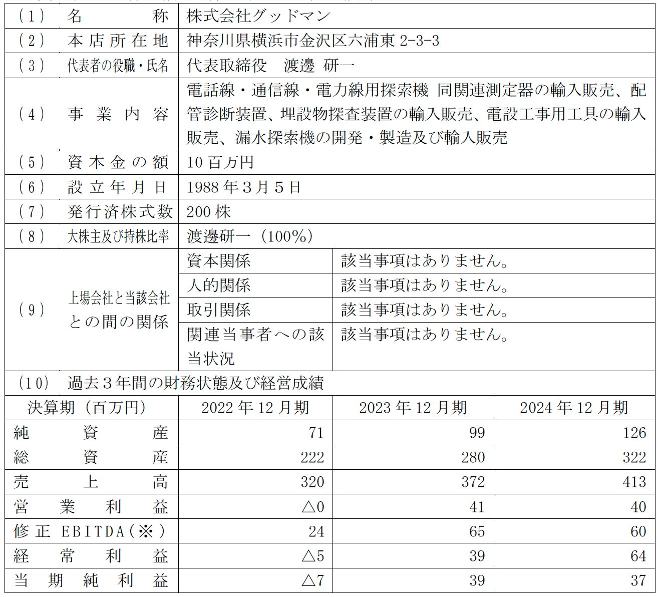 THE WHY HOW DO COMPANY 株式会社(本社︓東京都新宿区、執⾏役員社⻑CEO︓⻲⽥信吾、東証スタンダード︓3823、以下「ワイハウ」)は、本日開催の取締役会において、今期、人助けM&A第2号案件として電気・通信・水道等のインフラ保守点検に使われる測定機・探索機の輸入販売・自社製造及びAI技術を用いた常時自動監視型漏水探索機などの事業を行う株式会社グッドマン(代表取締役 渡邊 研一、神奈川県横浜市金沢区六浦東2-3-3、以下「グッドマン社」といいます。)の株式の100パーセントを取得し、子会社化することを決議いたしましたので、下記の通り、お知らせいたします。