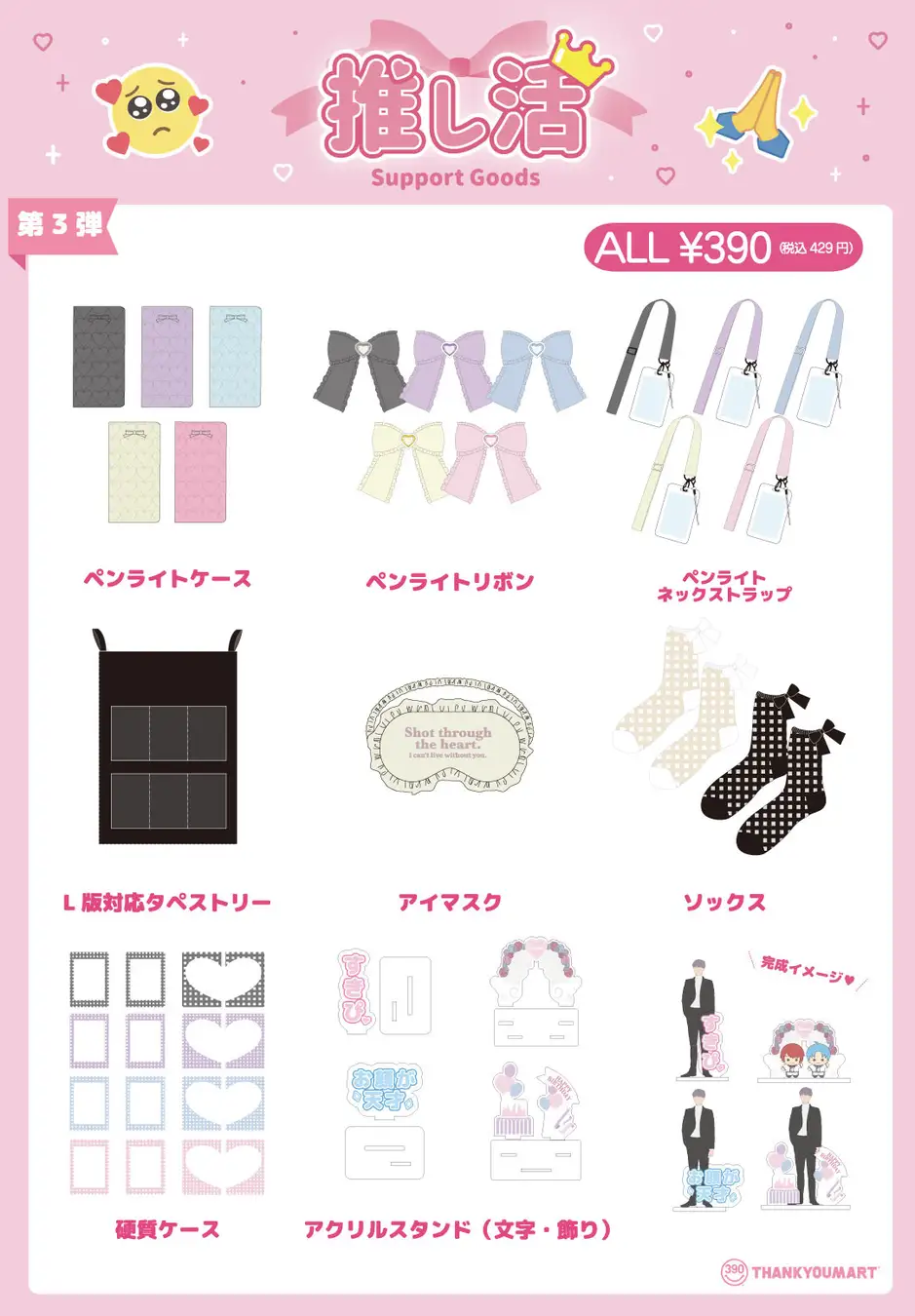 推し本人へ直接貢献でき、ライブ毎に変わる限定公式グッズは必ず買いたい!というファンのニーズに合わせて、サンキューマートでは公式グッズと合わせ使いができるプチプラ推し活グッズをワンコイン以下の価格で企画した商品です。