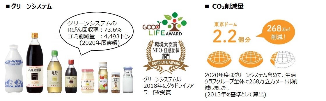 生活クラブでは、これまでも生産から廃棄に至るまで安全や健康、環境に配慮した品物の共同購入を通じ、持続可能な生活を実践してきました。特に1994年に開始した、統一規格のびん容器をリユースする仕組み「グリーンシステム」は20年以上にわたる一連の取組みが評価され、2018年に「第6回 環境省グッドライフアワード環境大臣賞(NPO・任意団体部門)」を受賞しました。今後も資源温存、CO2削減を喫緊の課題ととらえ対策を推し進めてまいります。