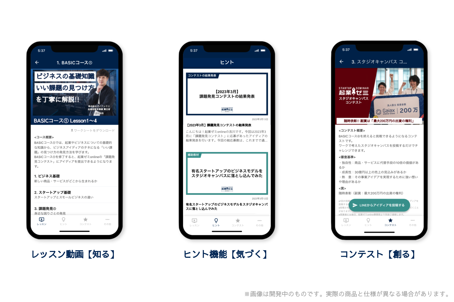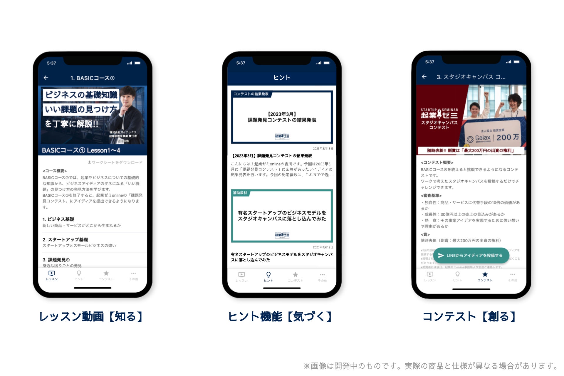 また、学習を進めるうえで分からないことや相談事が出てきた際には、「起業ゼミ」の公式LINEから直接ガイアックスメンバーに質問もでき、生徒たちはこれらの機能を活用しながら、スモールステップで起業やビジネスについて学び、自身の興味・関心をベースにゼロから事業アイディアを考えることができます。